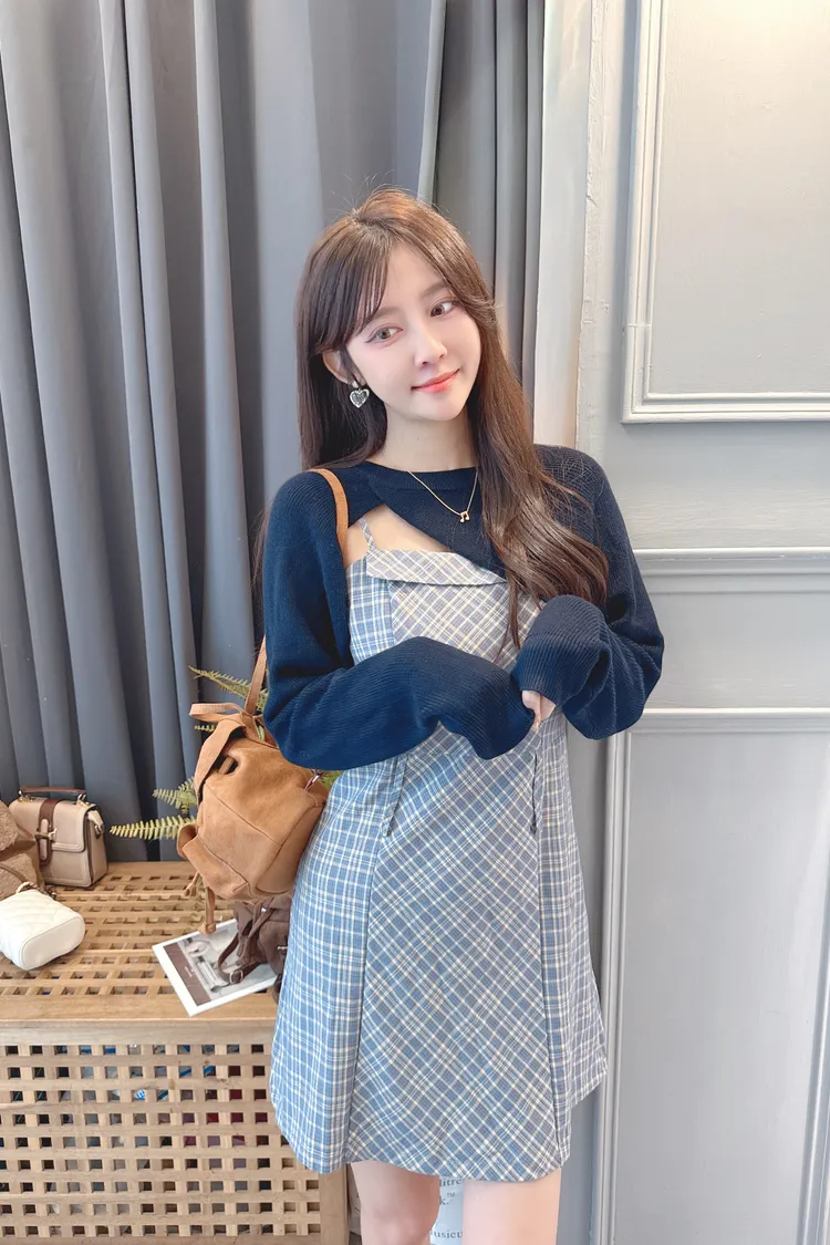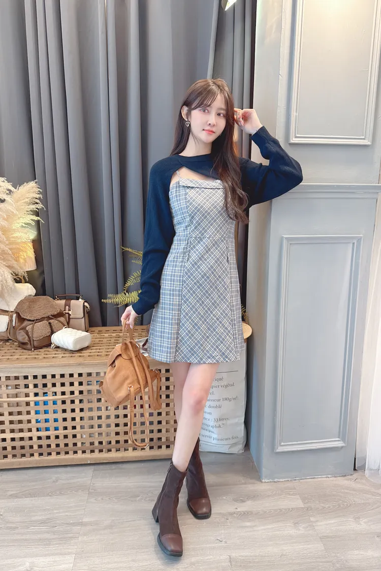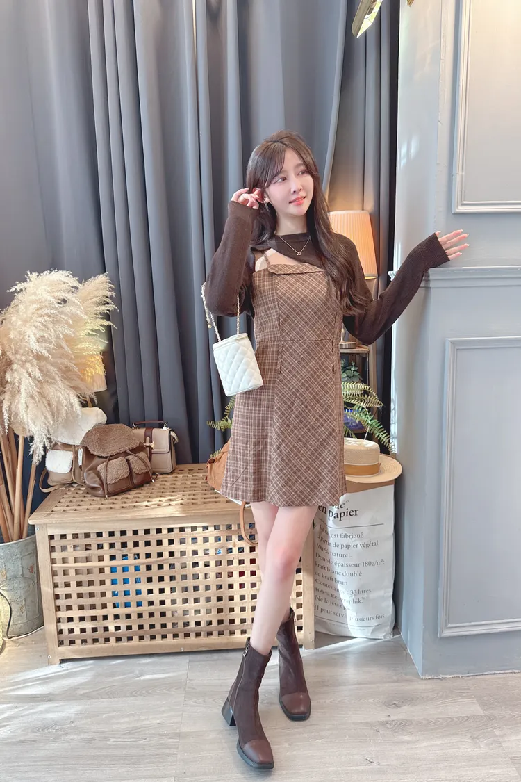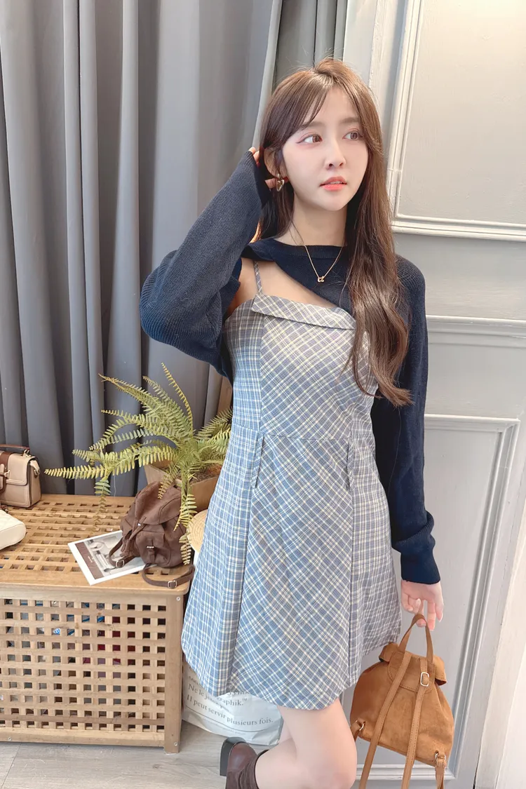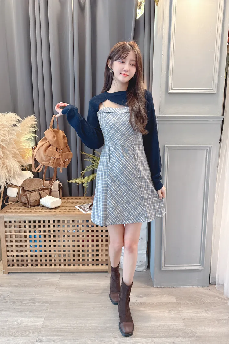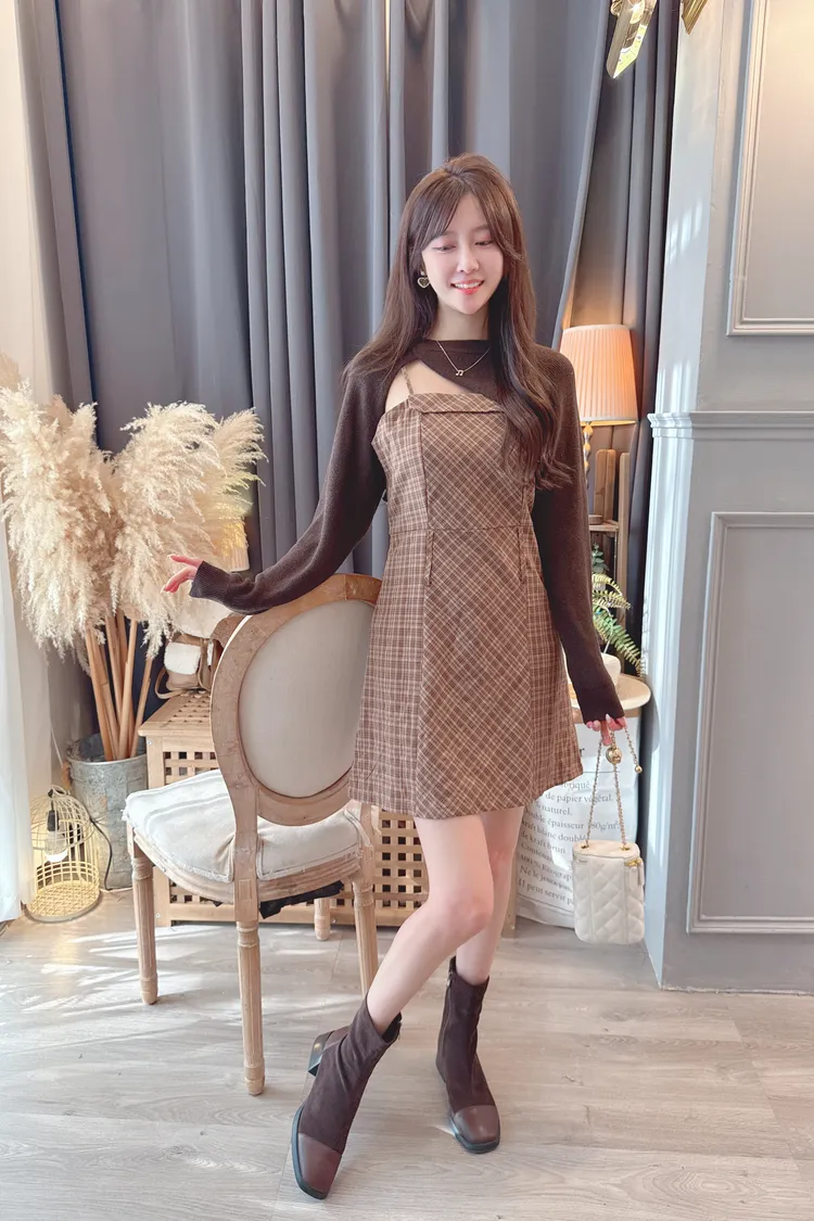 短版罩衫加格紋短洋套裝組/2色
