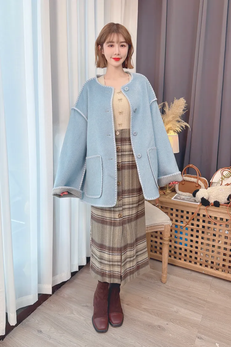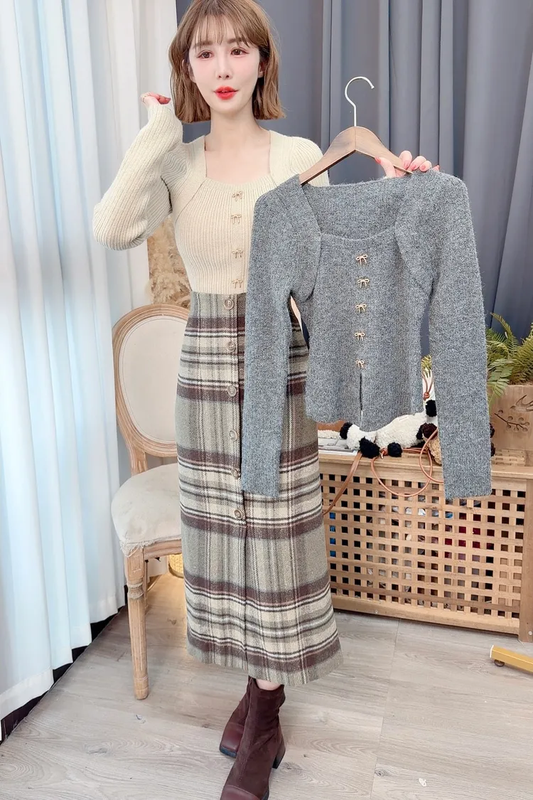 前排釦毛料格紋長裙/1色