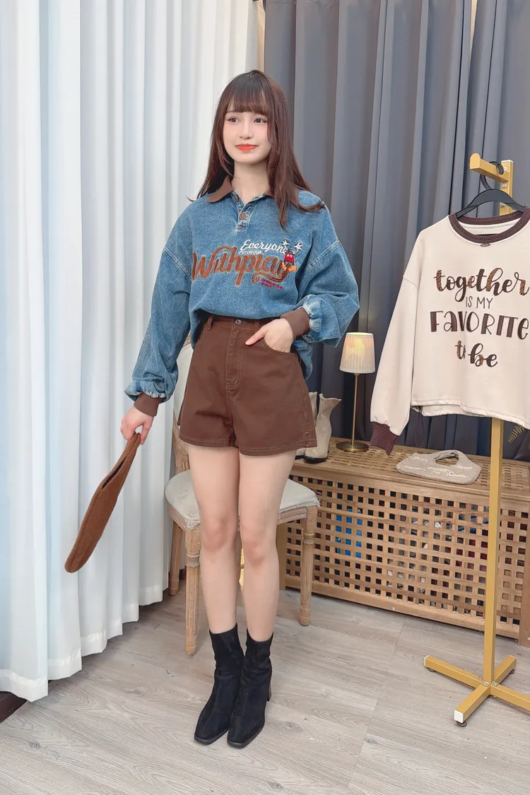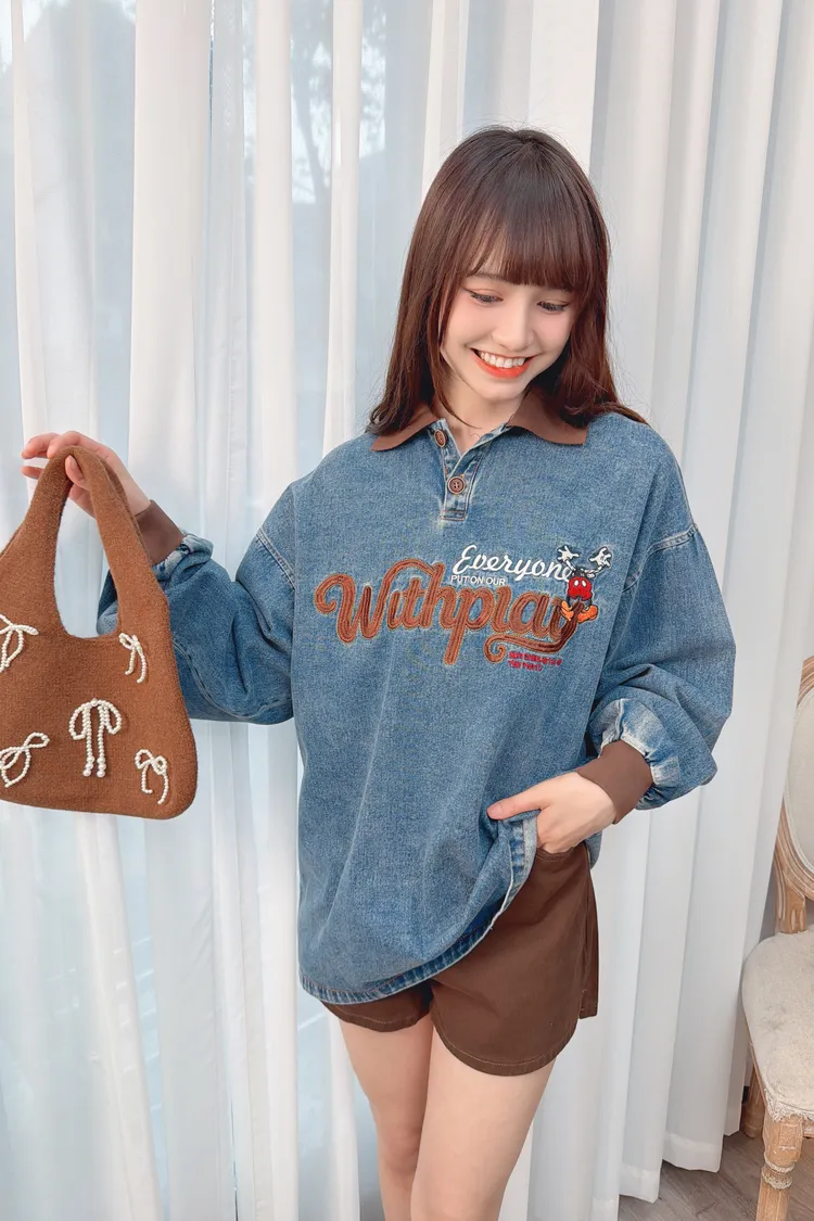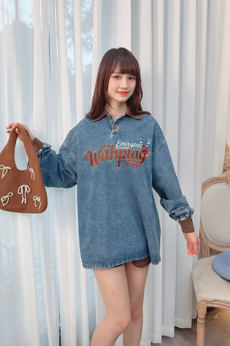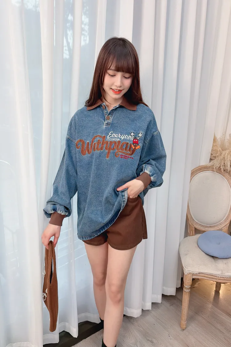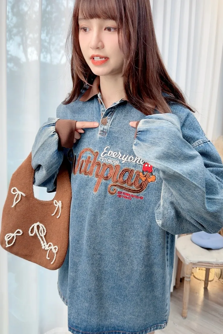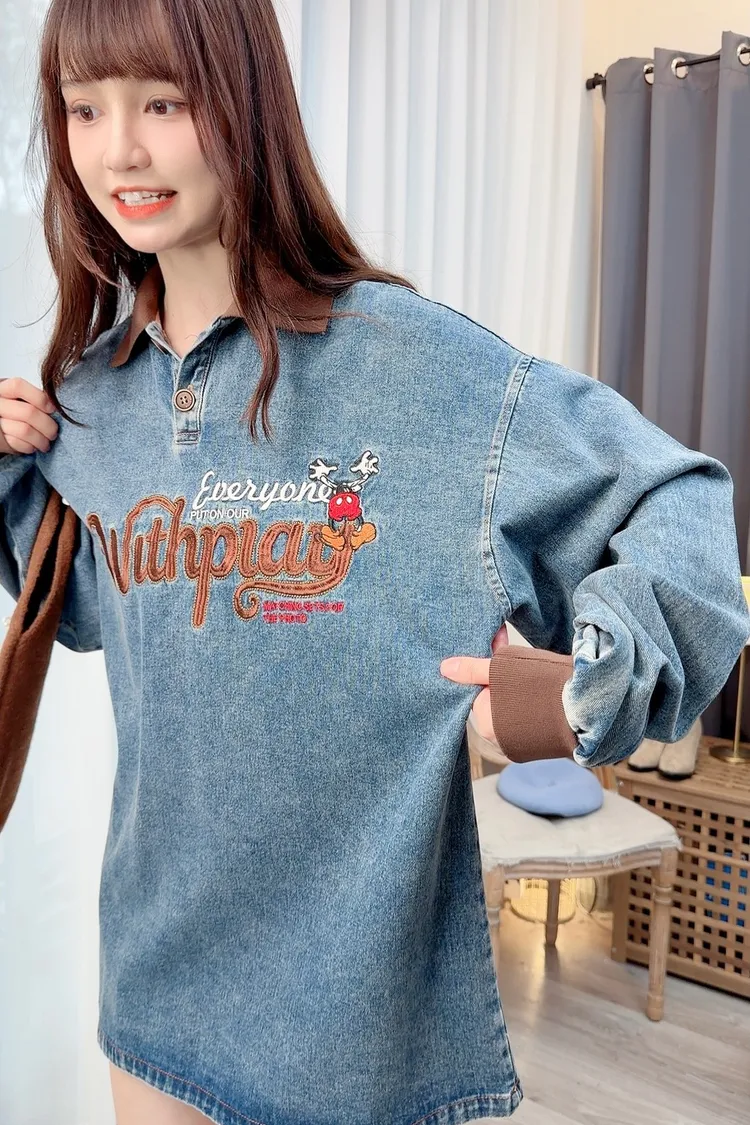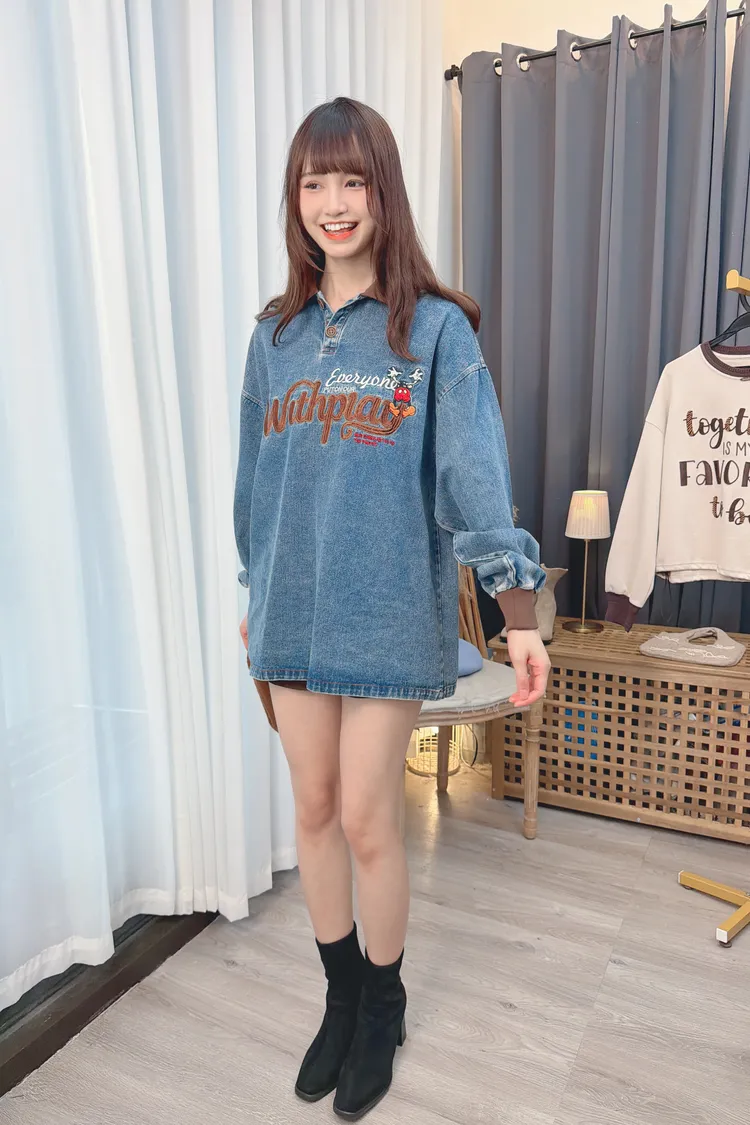 可愛圖案牛仔有領長版上衣/1色