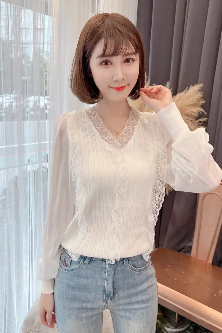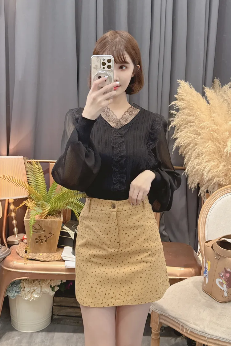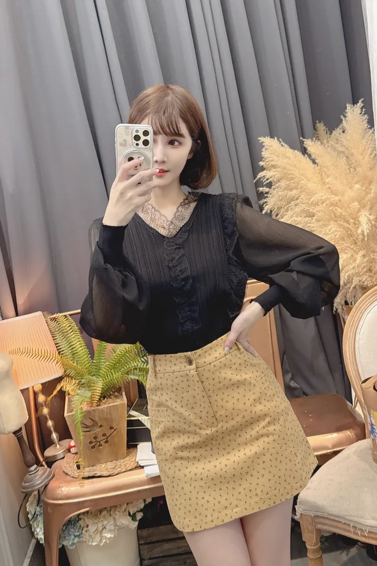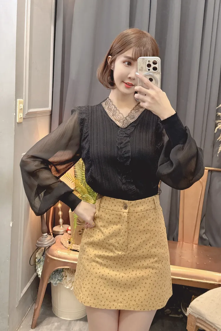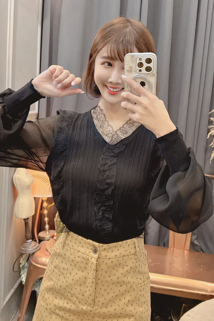 蕾絲V領雪紡袖上衣/2色
