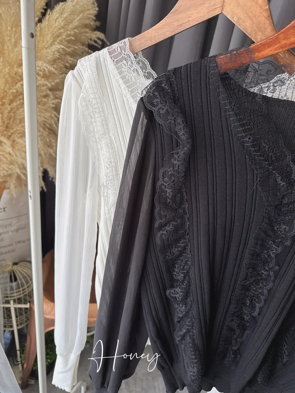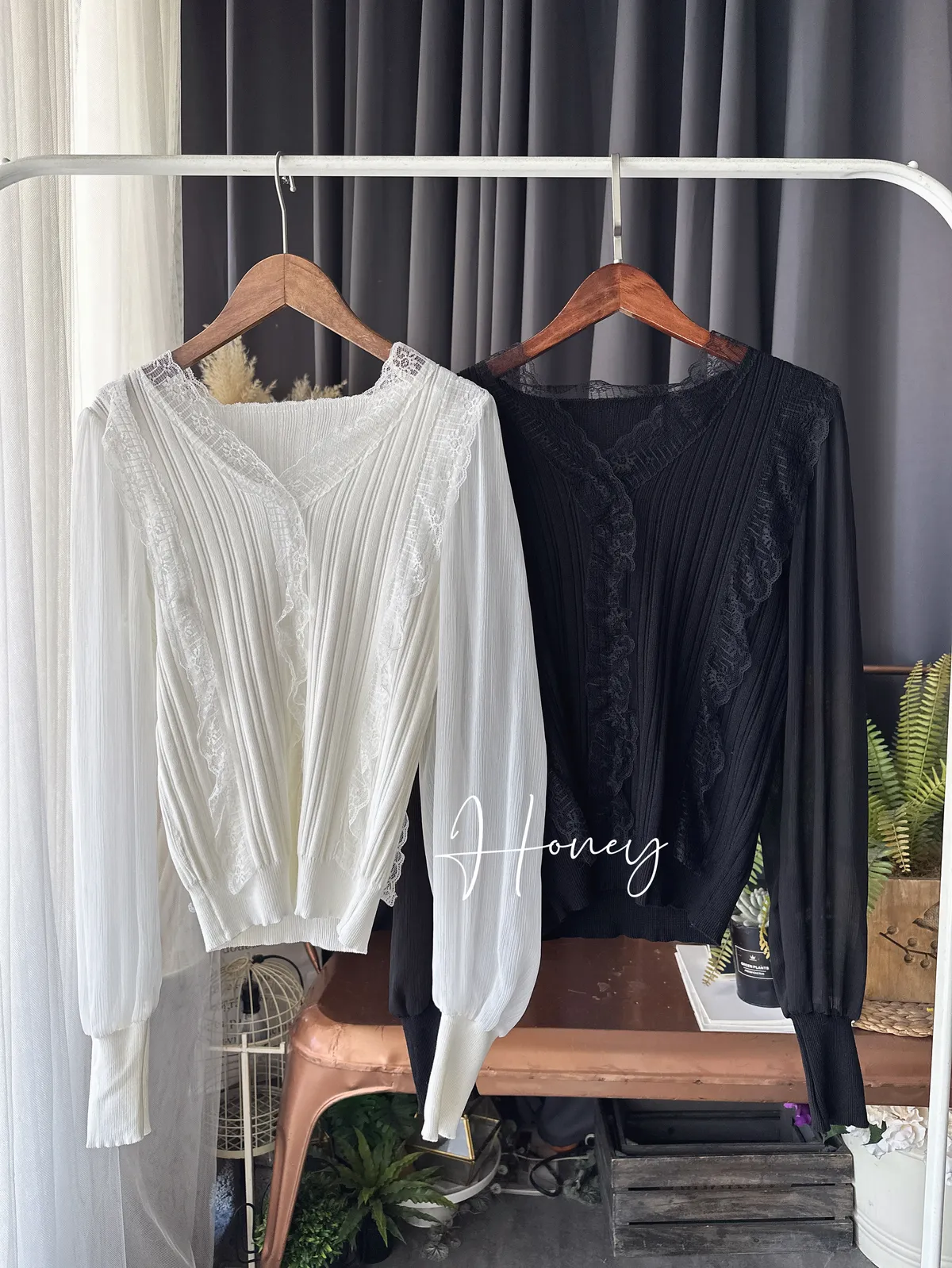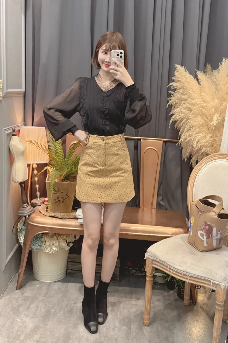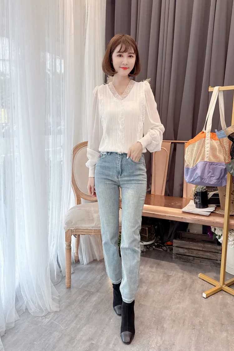 蕾絲V領雪紡袖上衣/2色