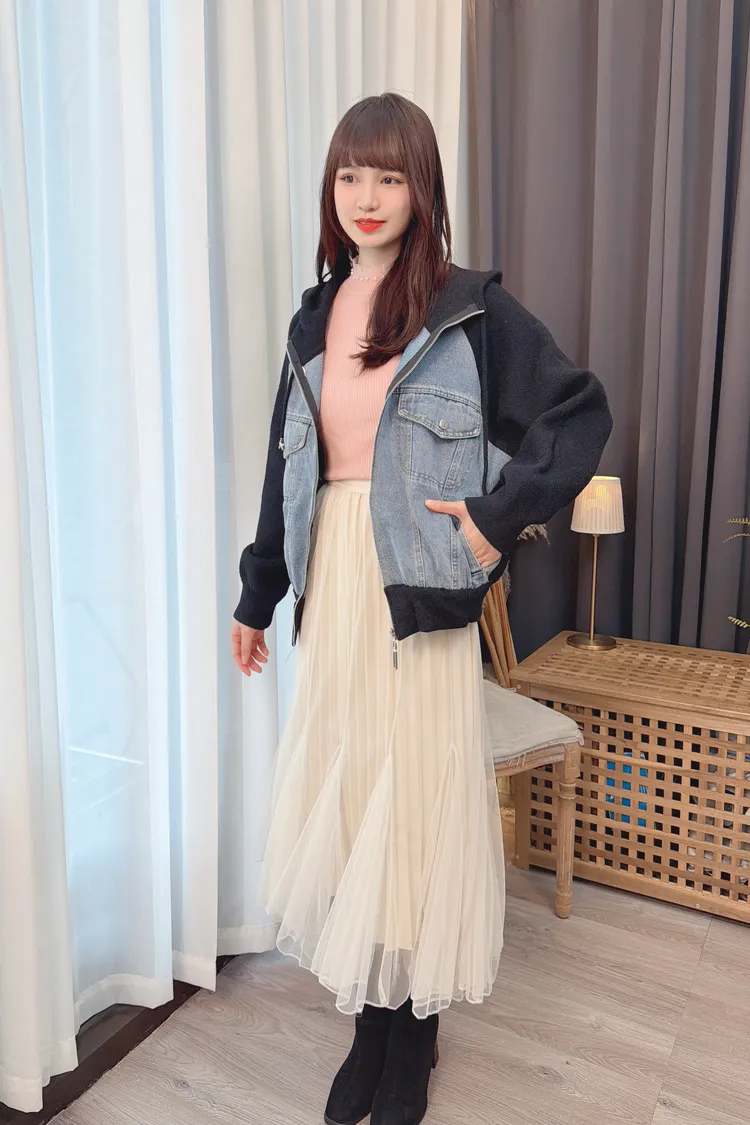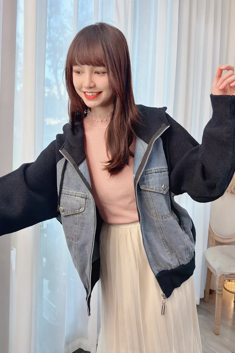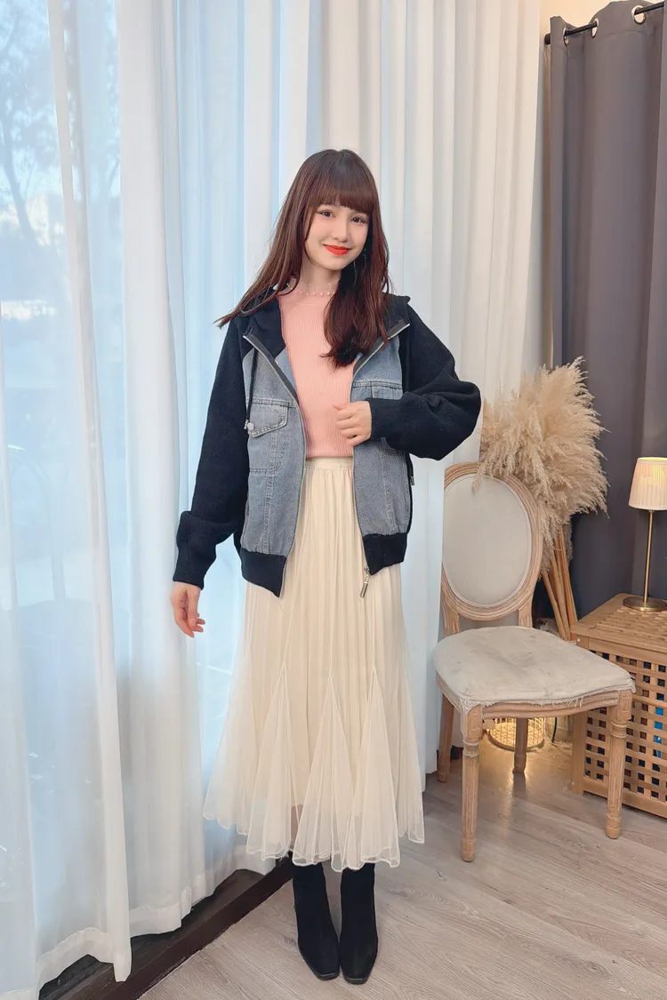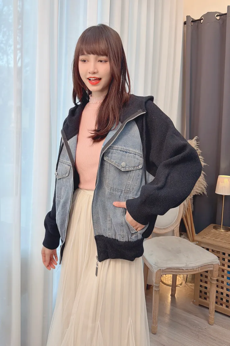牛仔拼接連帽針織外套上衣/1色