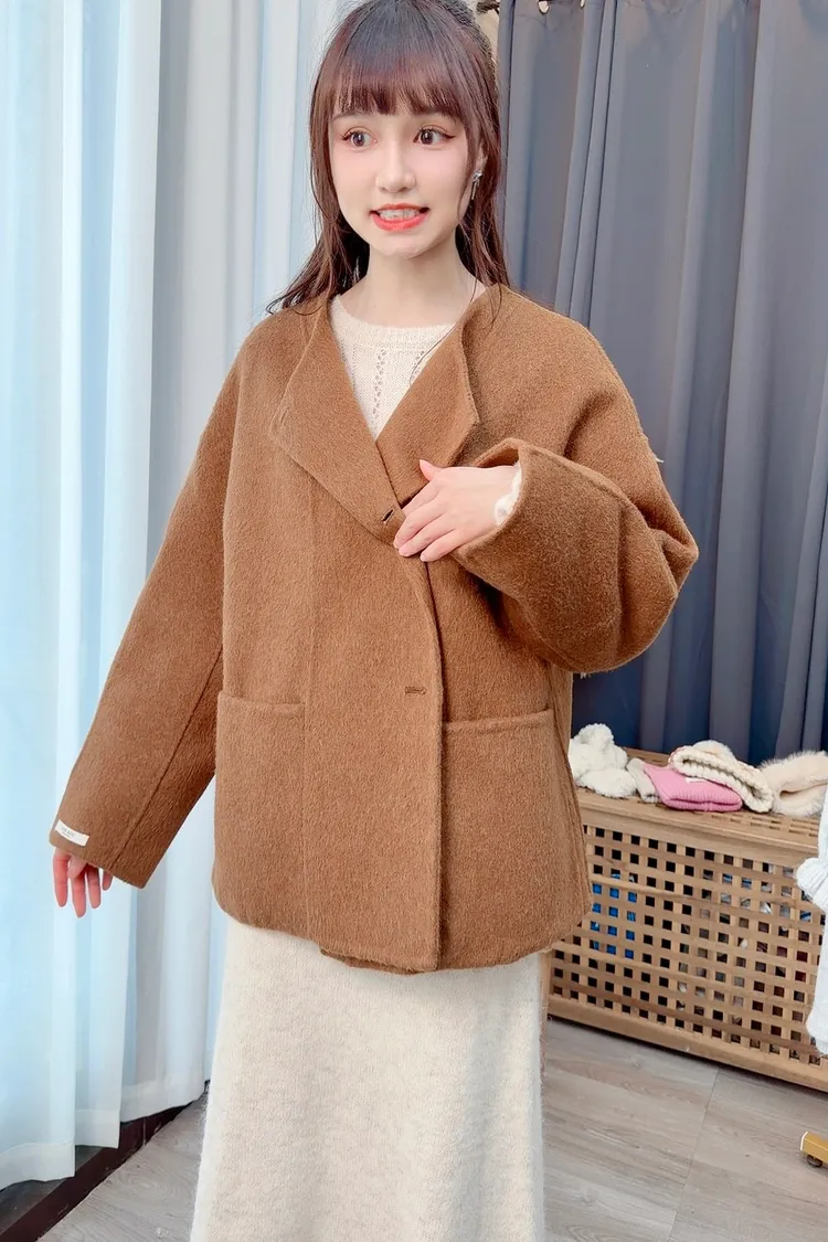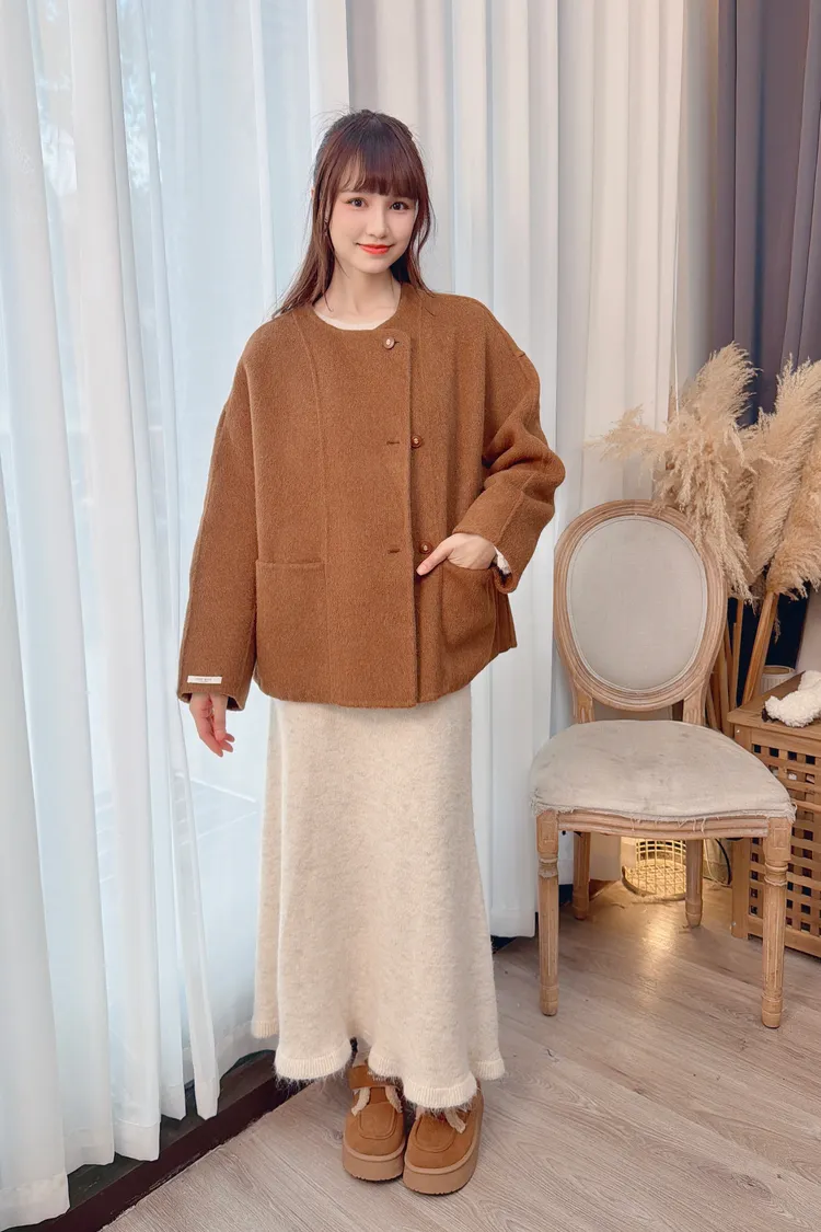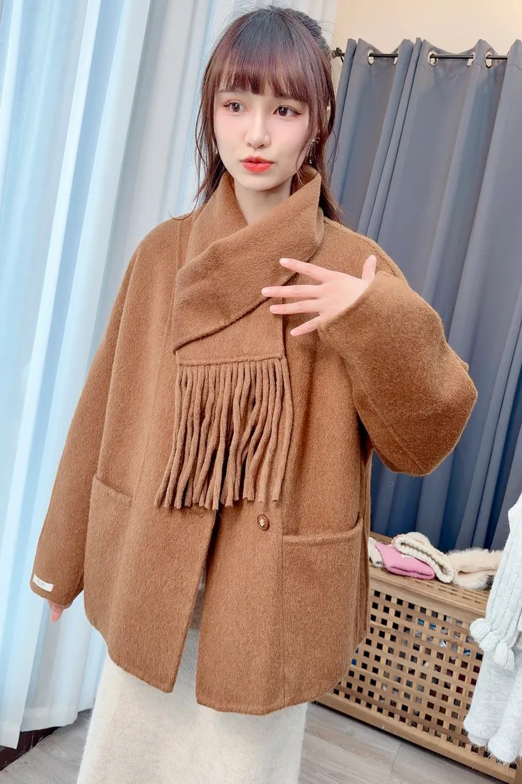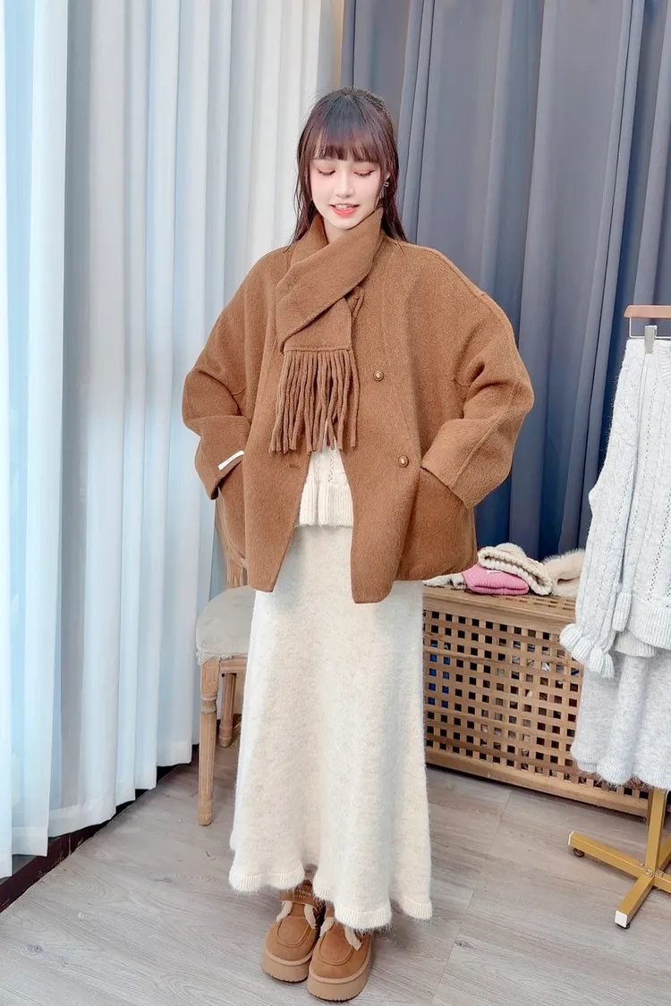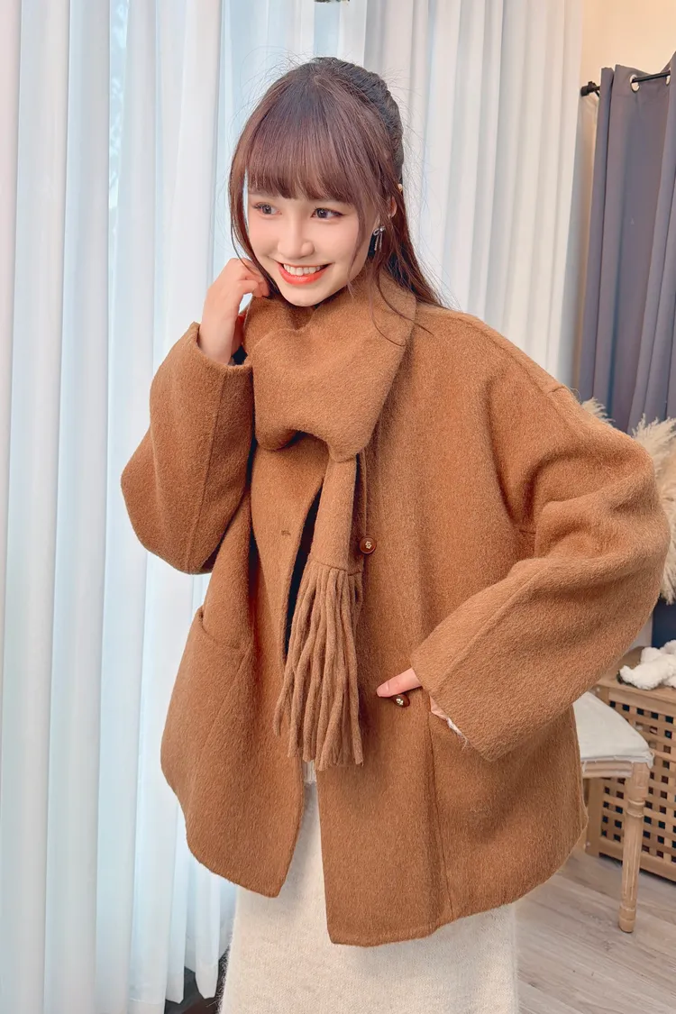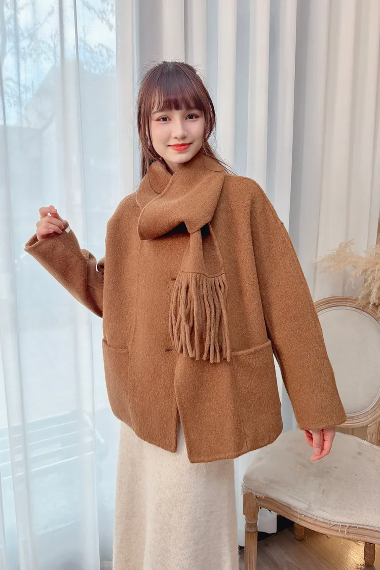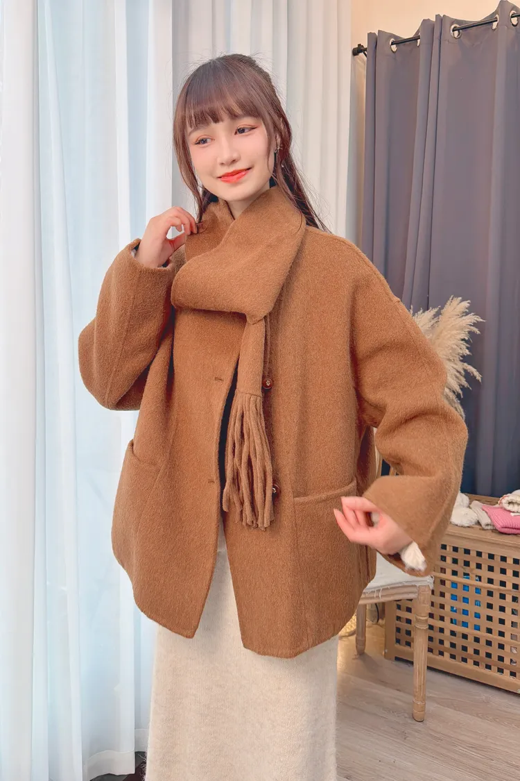 附圍巾手工羊毛大衣/3色