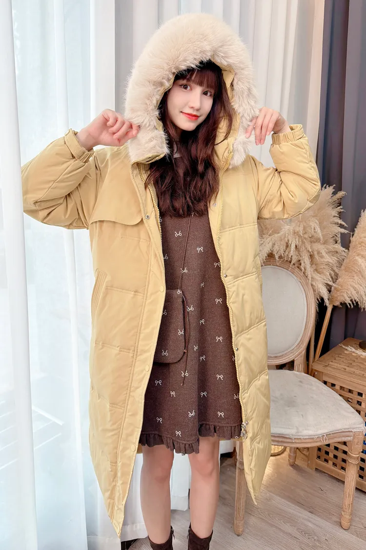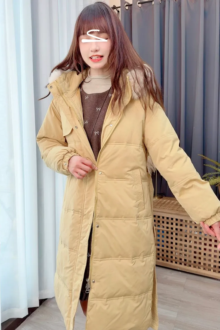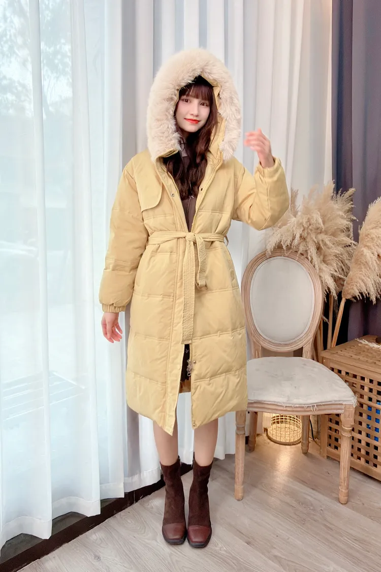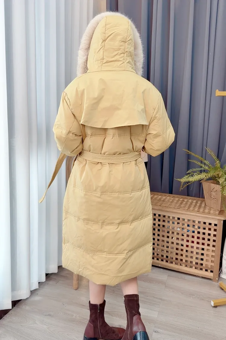 90%羽絨腰綁帶連帽毛毛外套/3色
