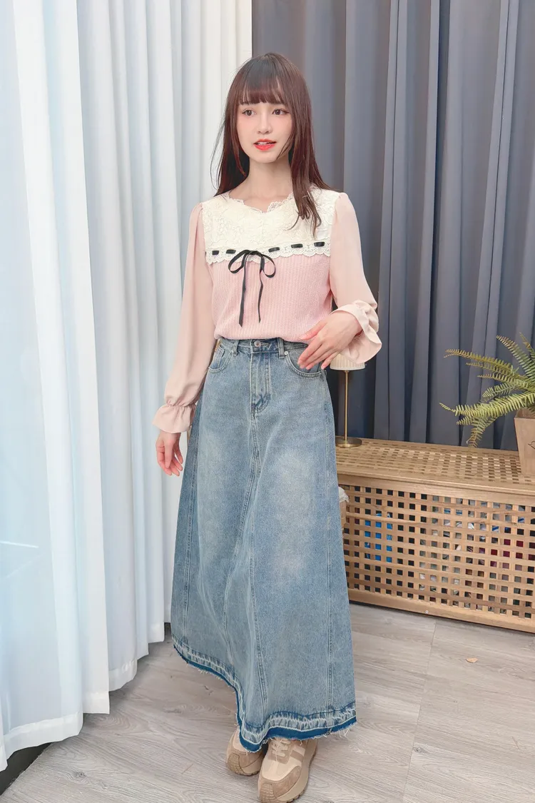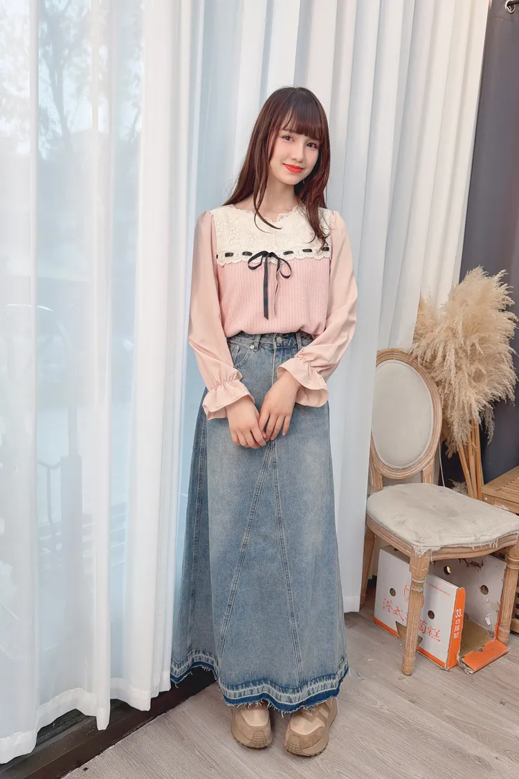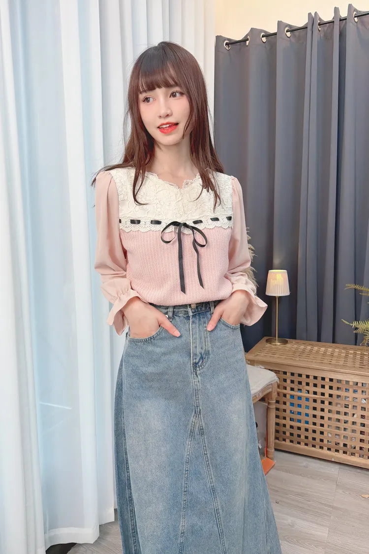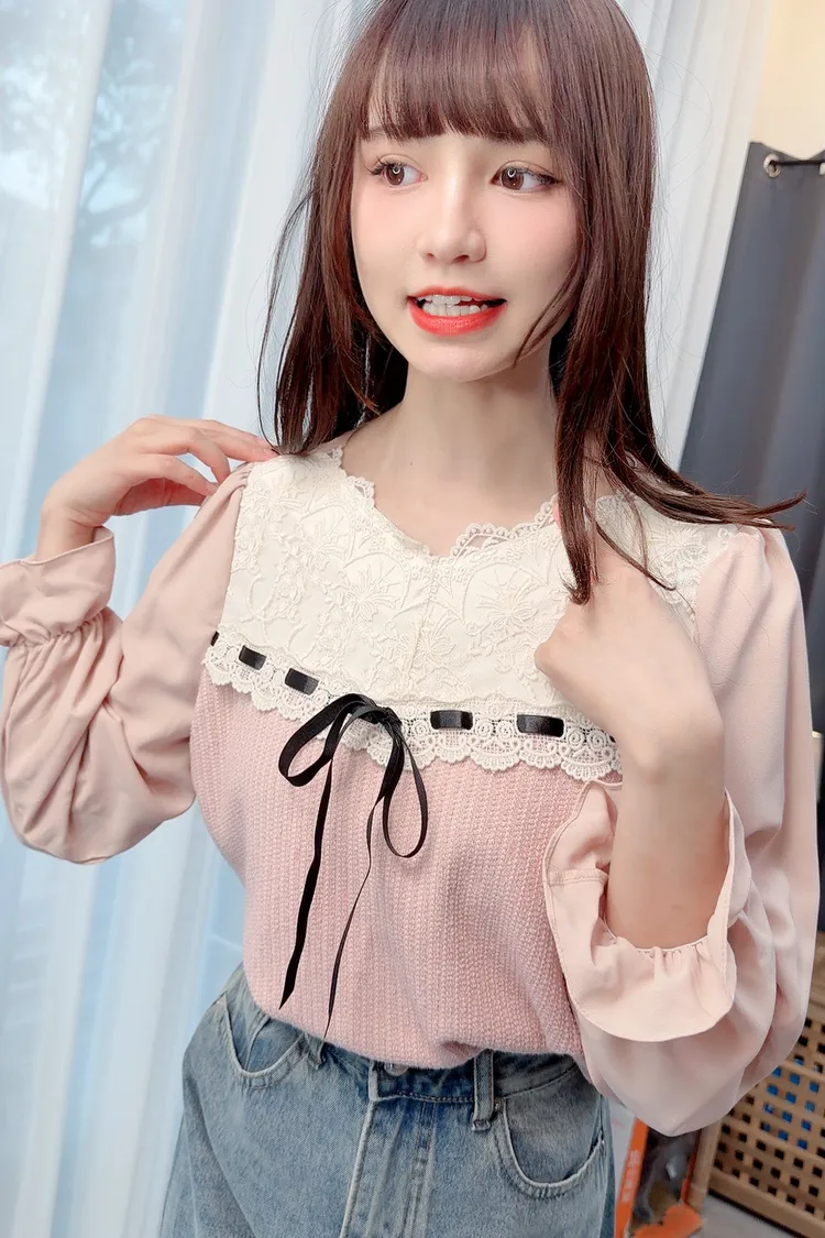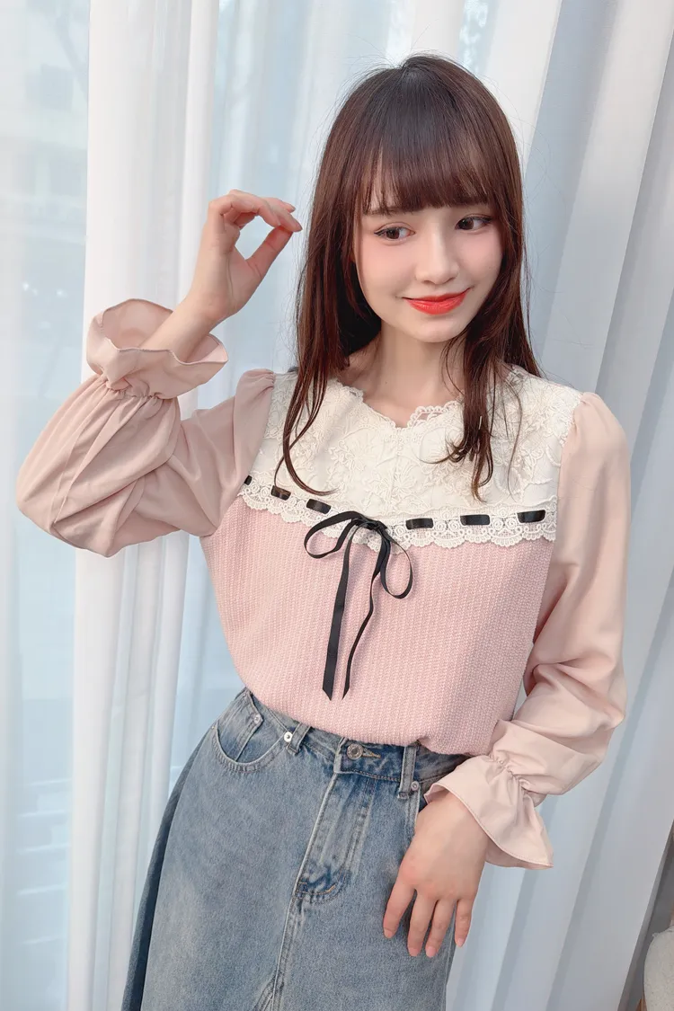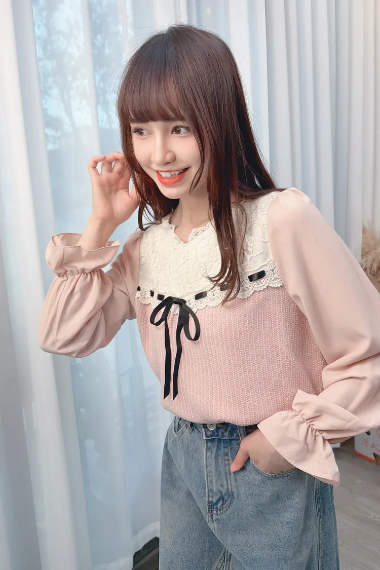 蕾絲拼接蝴蝶結雪紡上衣/1色