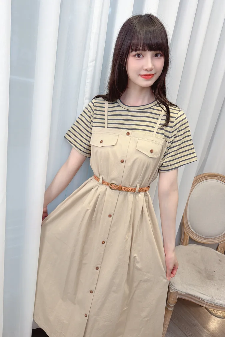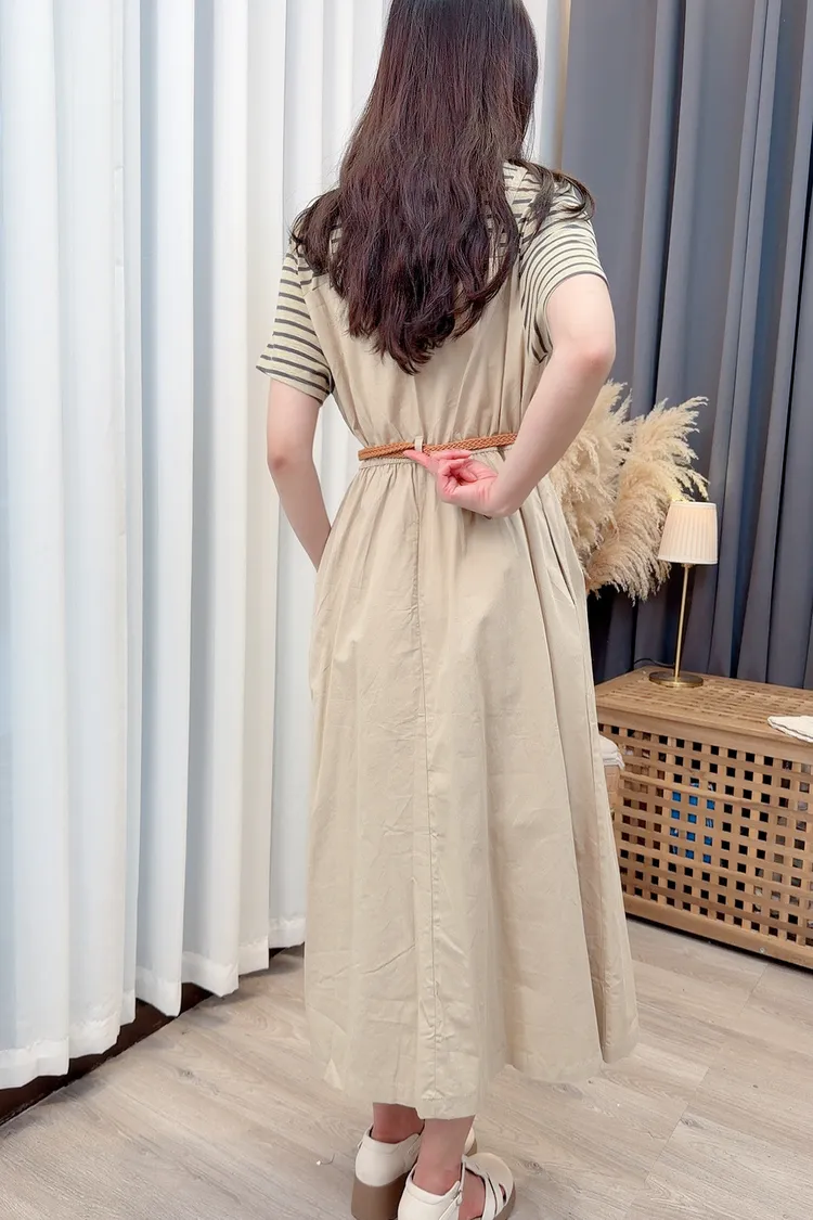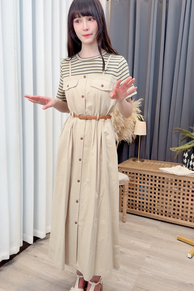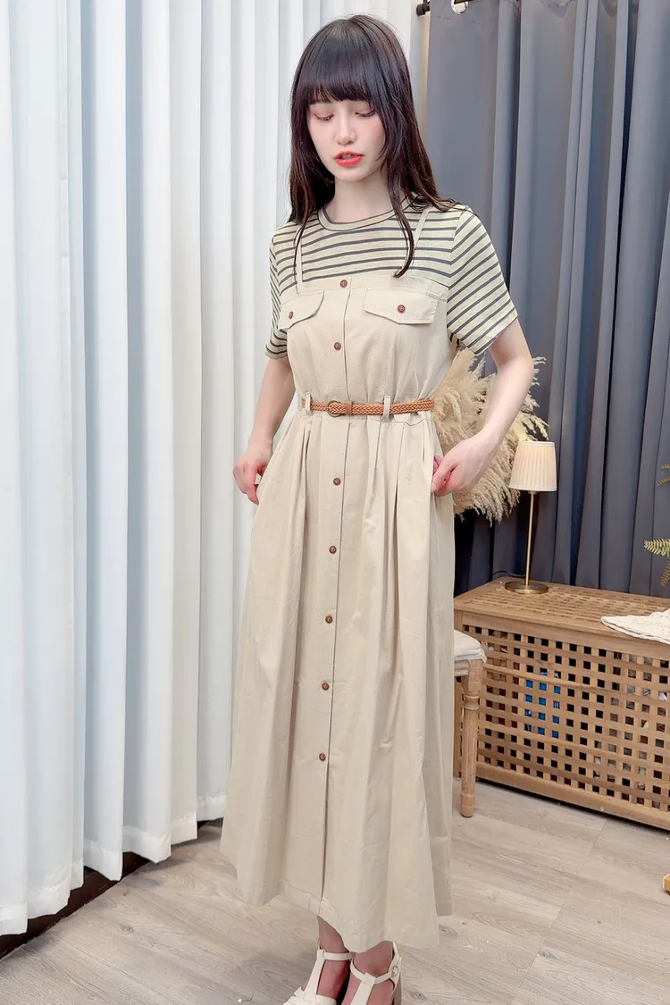 條紋假兩件附腰帶洋裝/1色