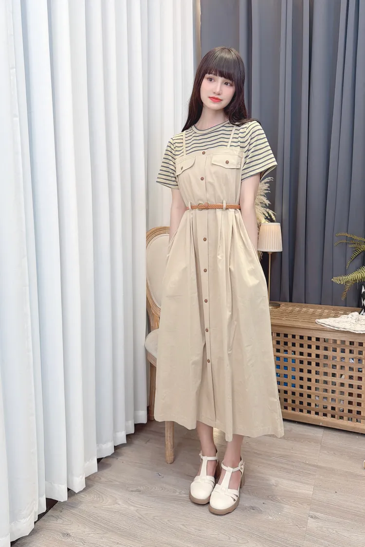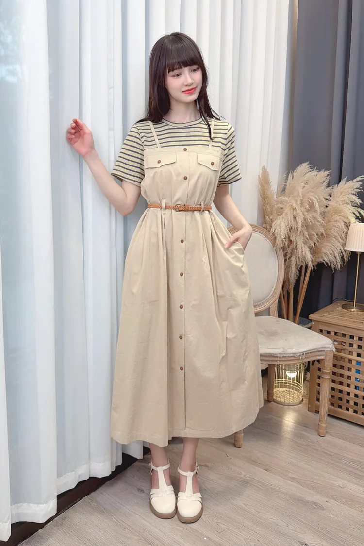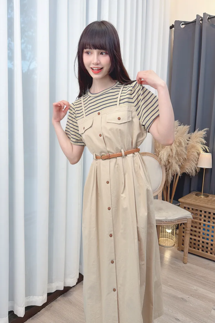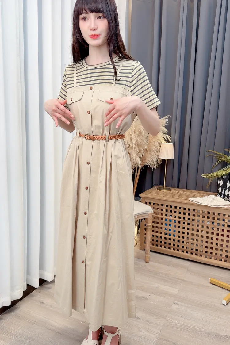 條紋假兩件附腰帶洋裝/1色