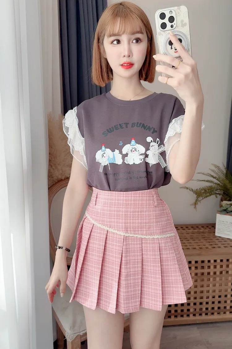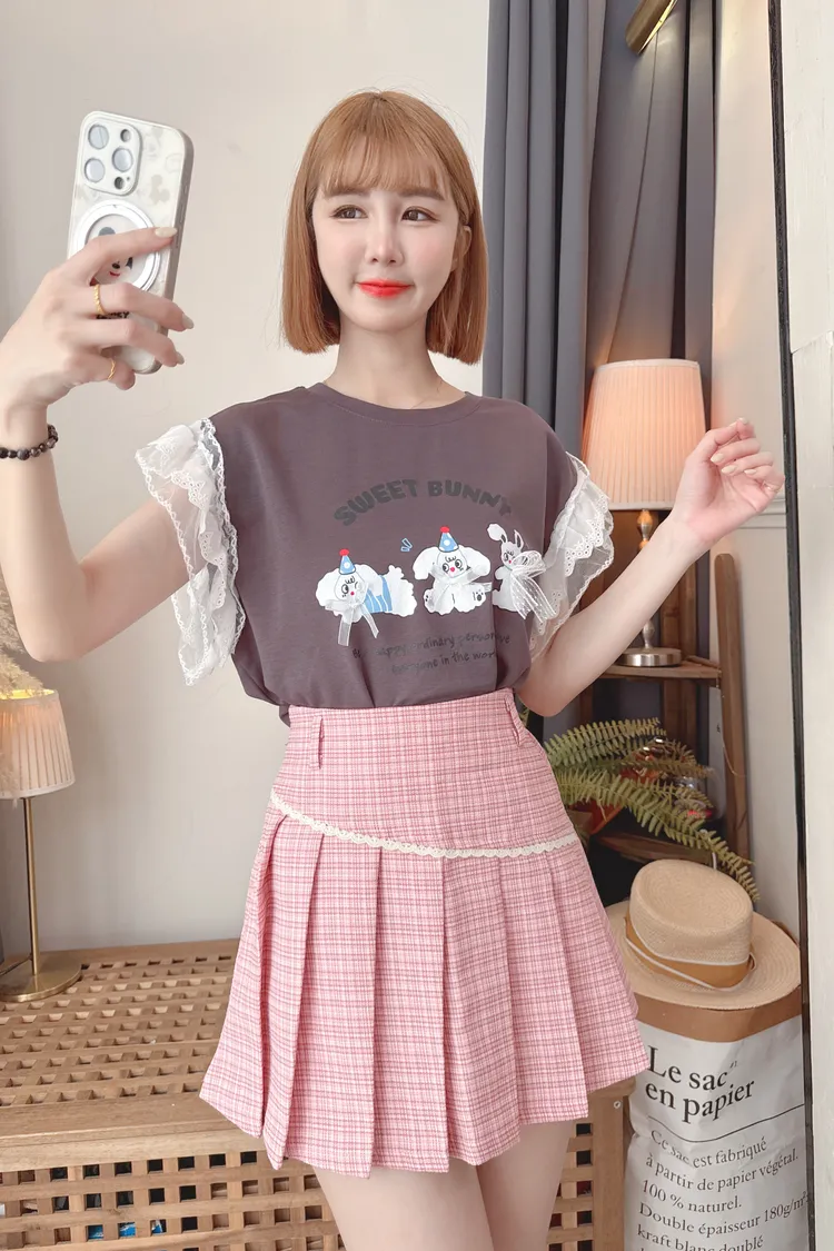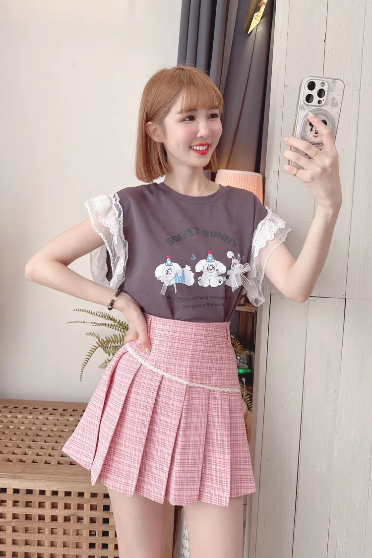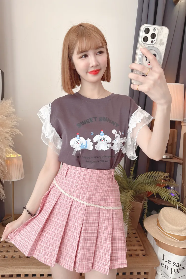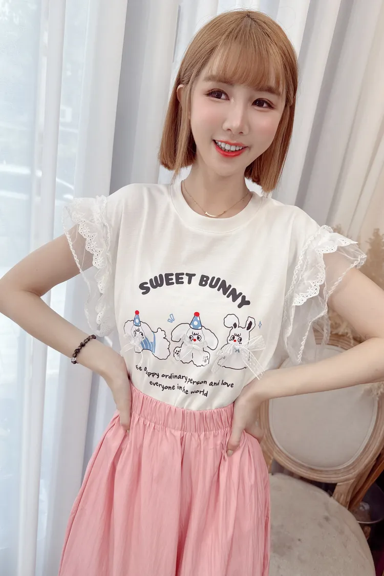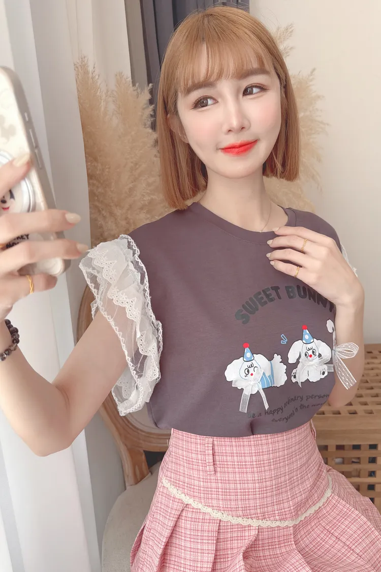 可愛圖案袖蕾絲上衣/2色