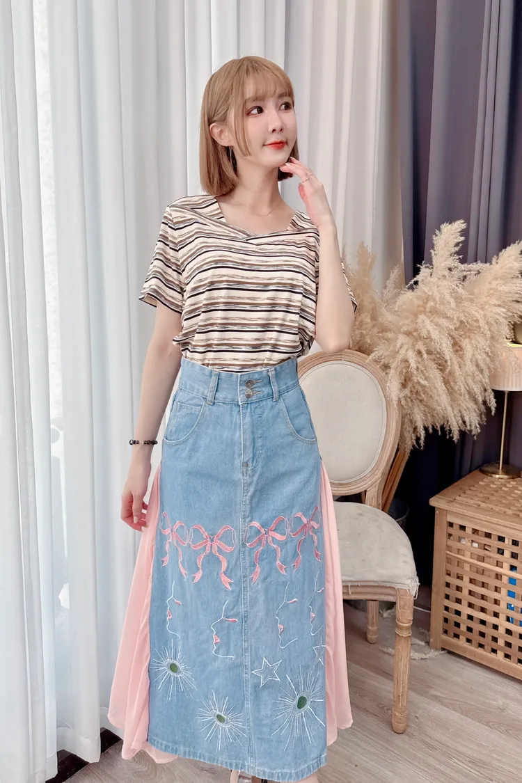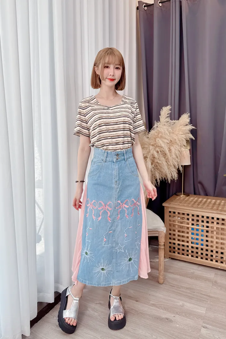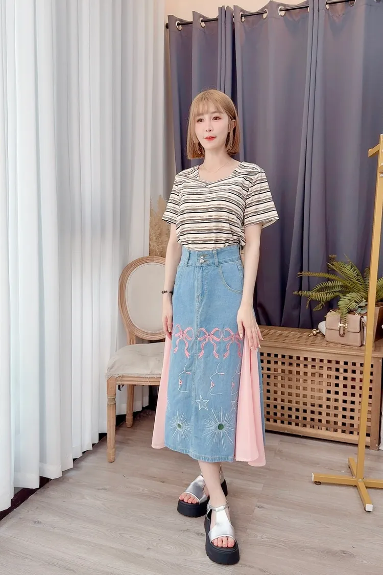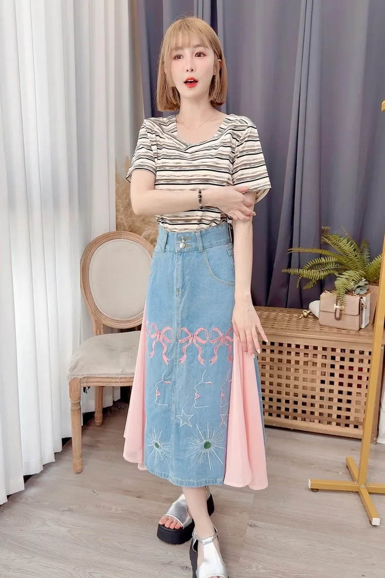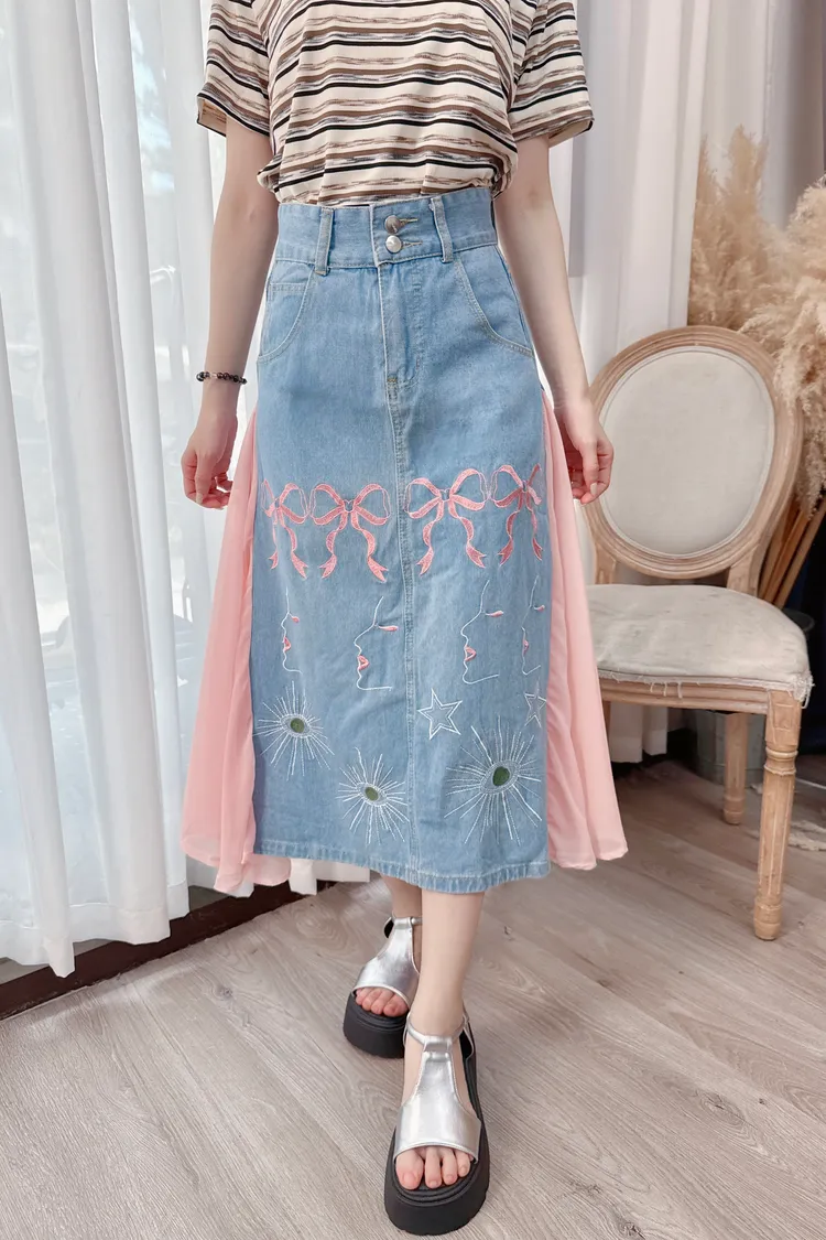 雪紡拼接蝴蝶結圖案牛仔裙/1色