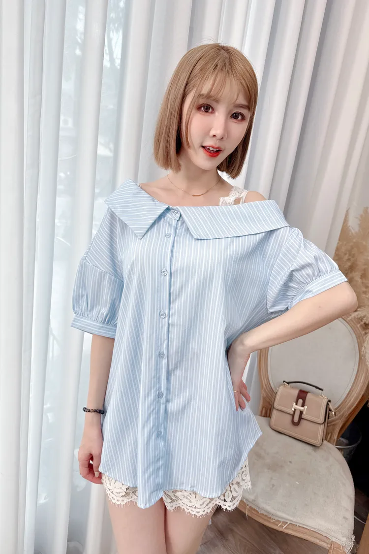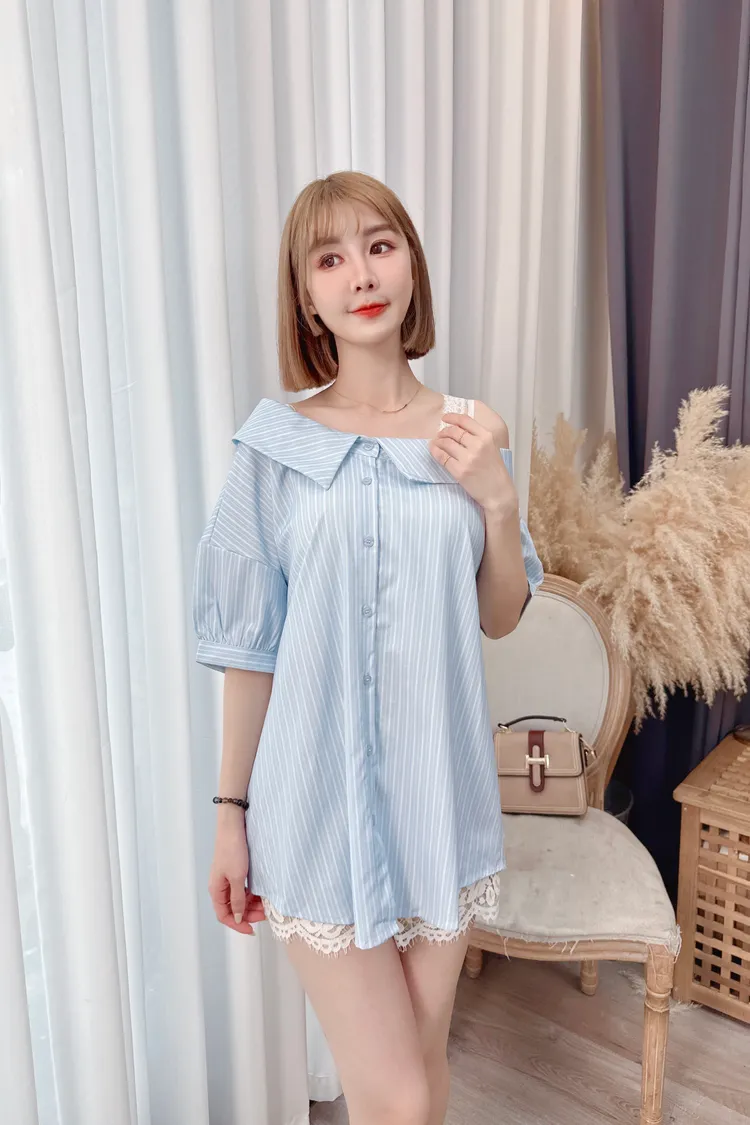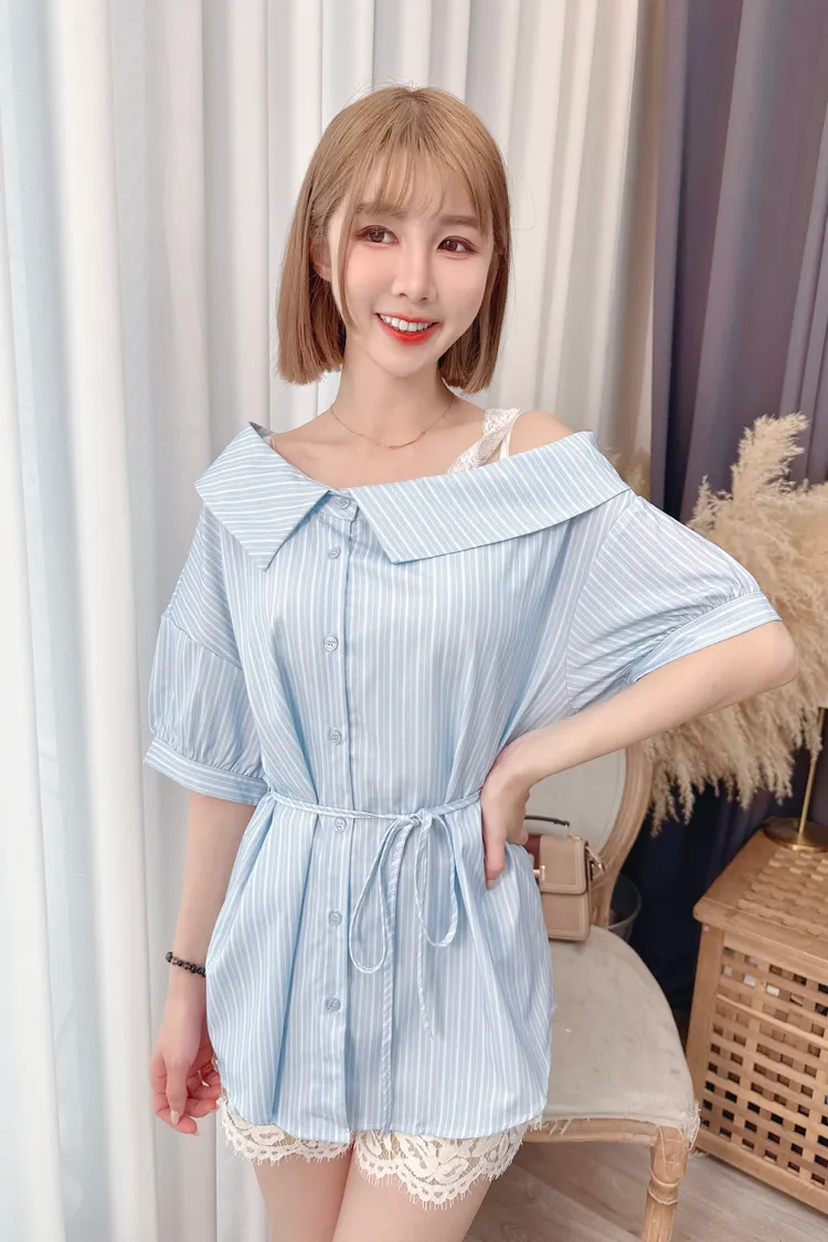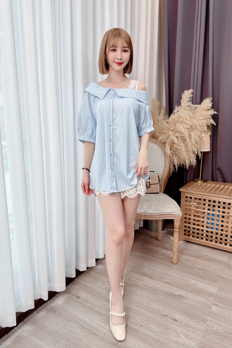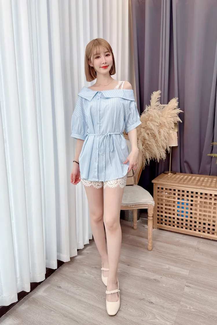 直條露肩蕾絲縮腰襯衫上衣/1色