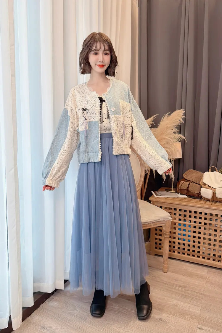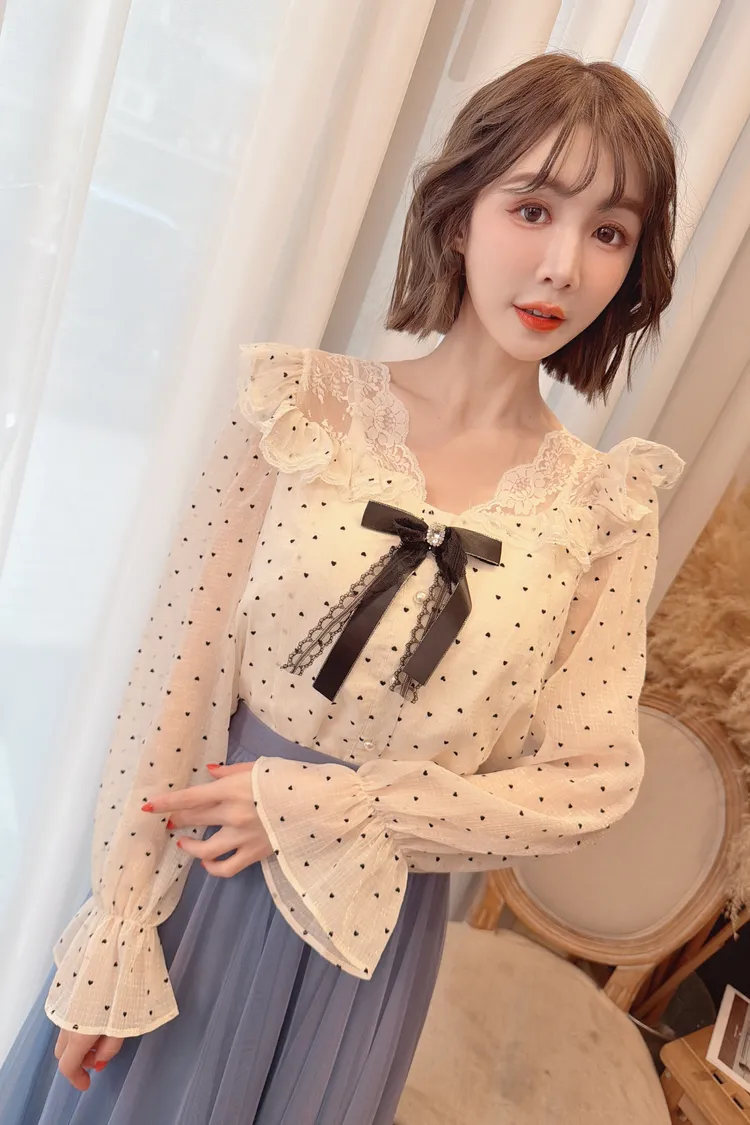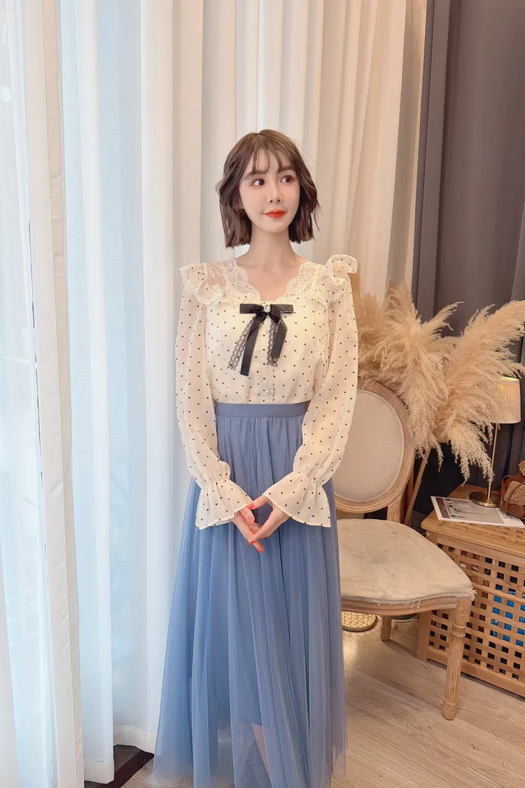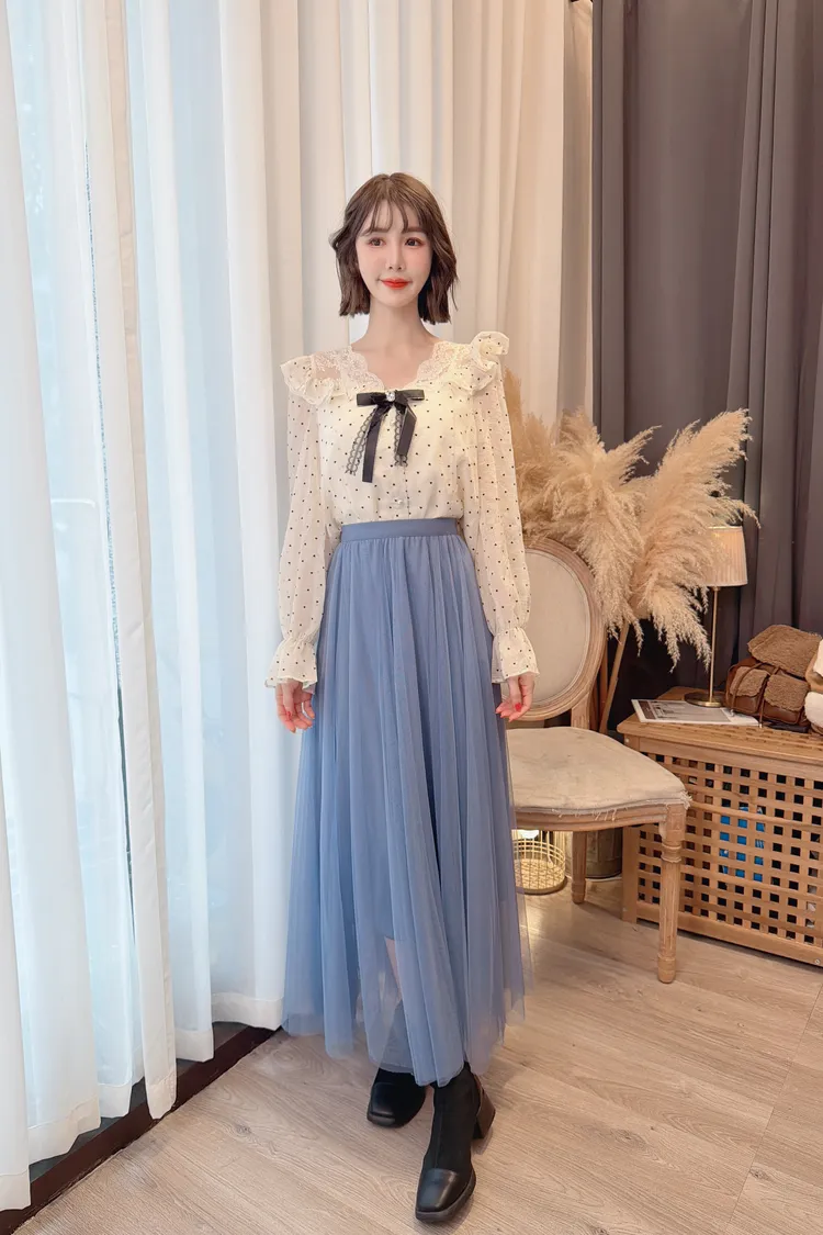 蕾絲點點拼接荷葉上衣/1色