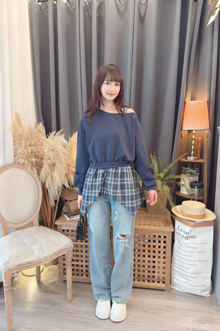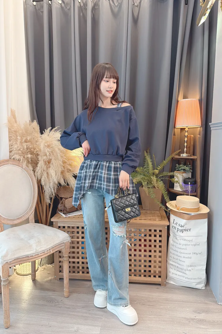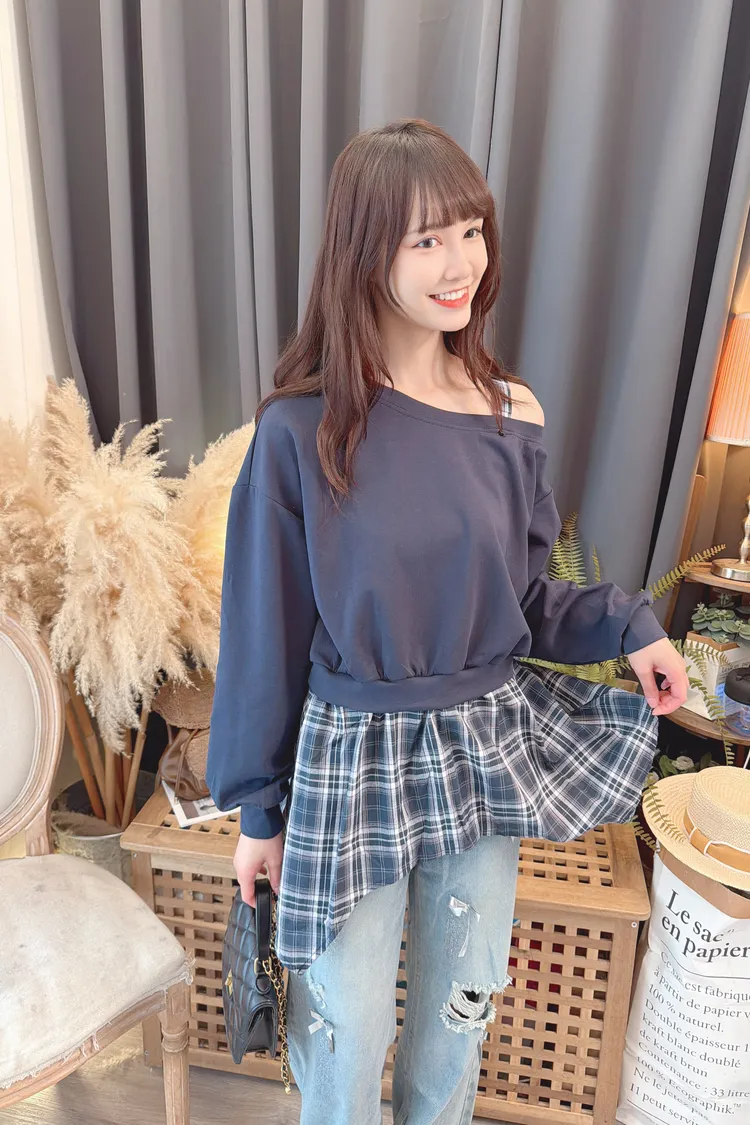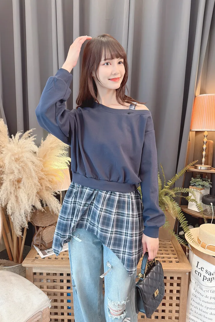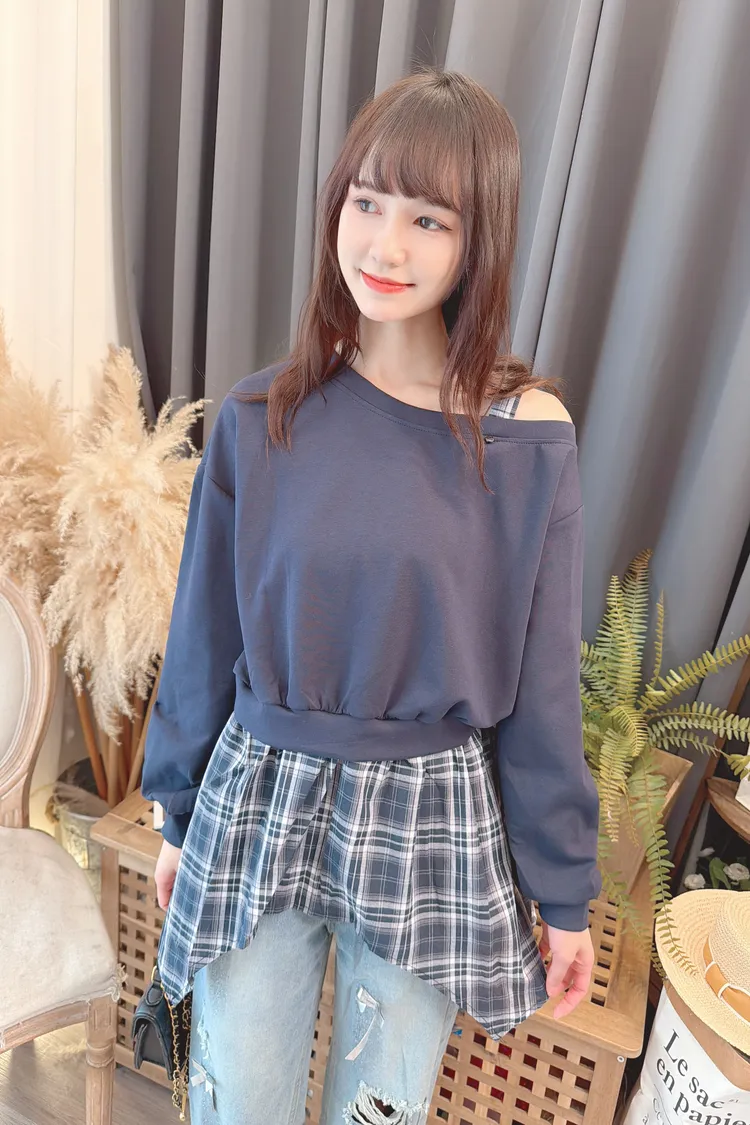 格紋不規則露肩上衣/2色