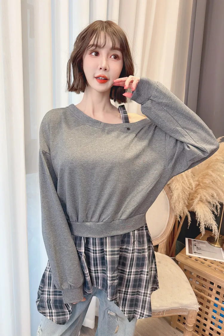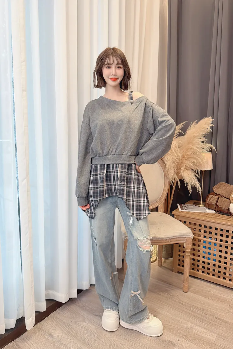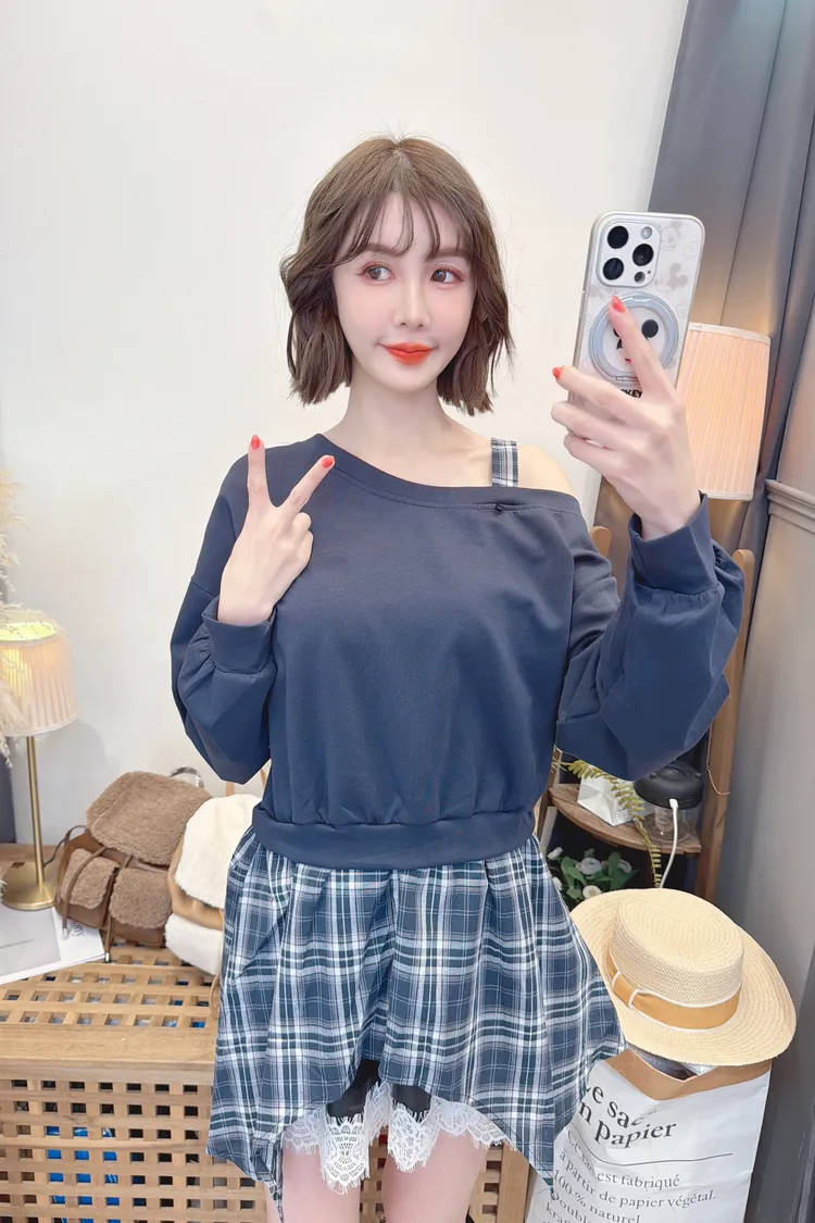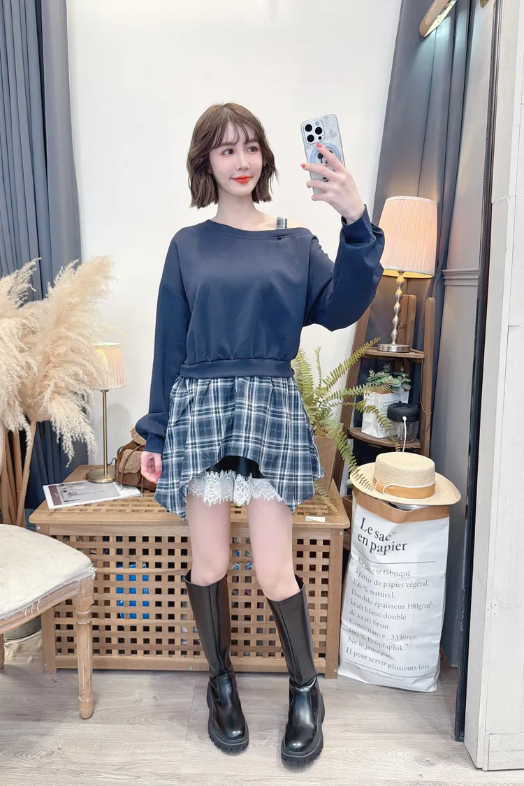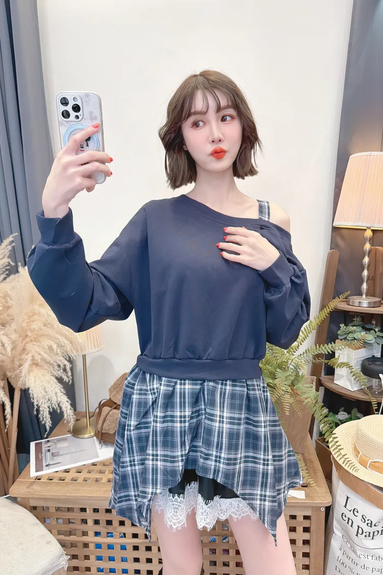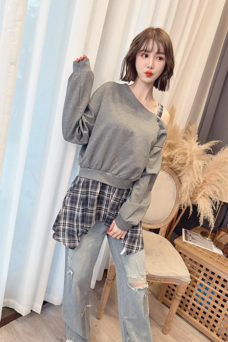 格紋不規則露肩上衣/2色