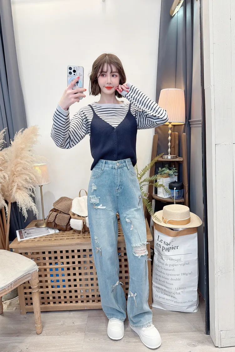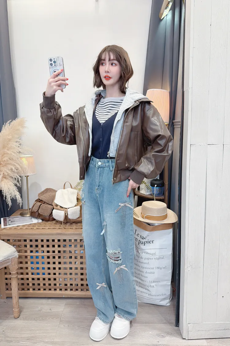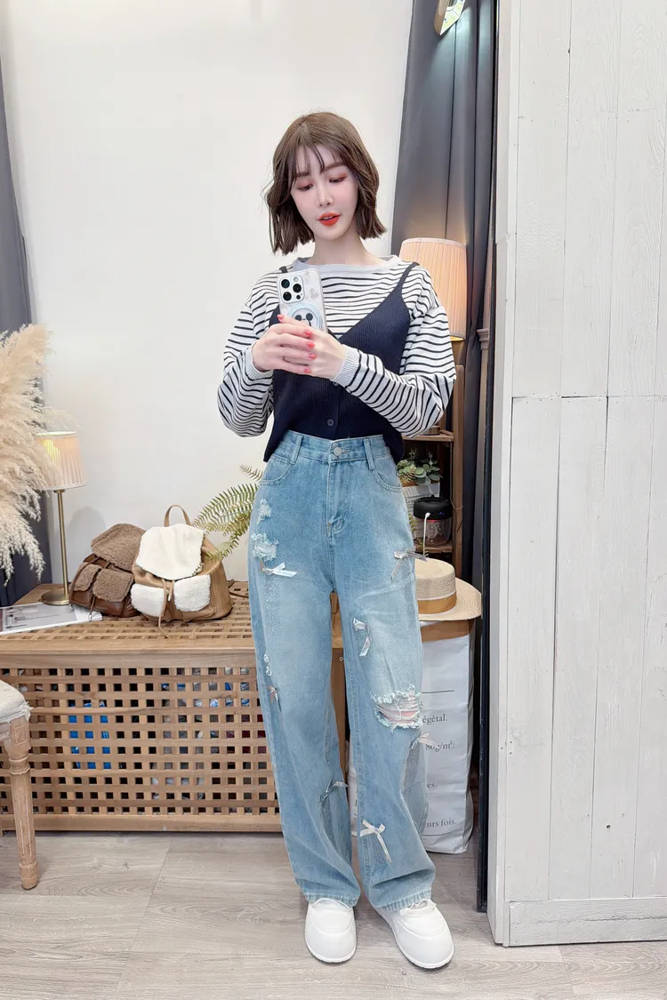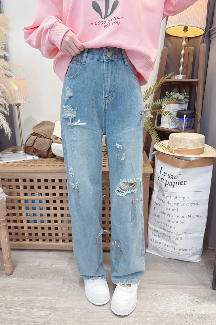 蝴蝶結刷破造型牛仔直筒寬褲/1色