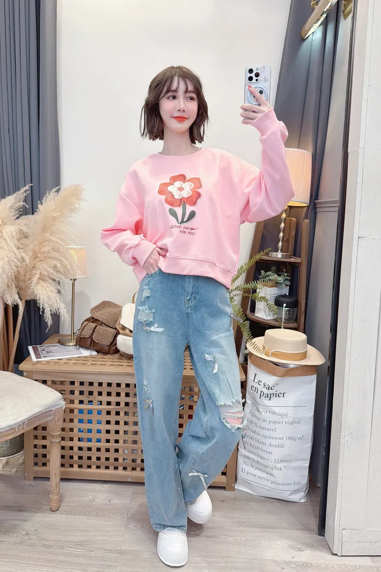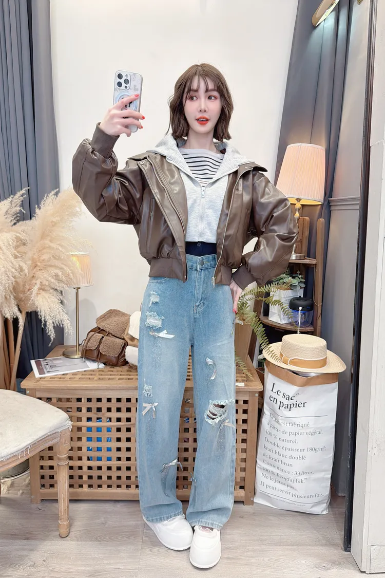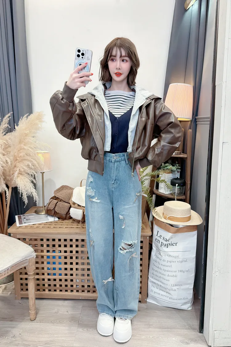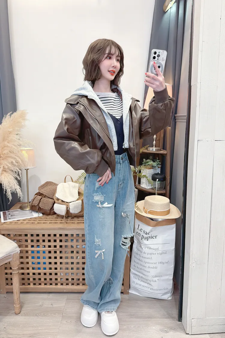 蝴蝶結刷破造型牛仔直筒寬褲/1色