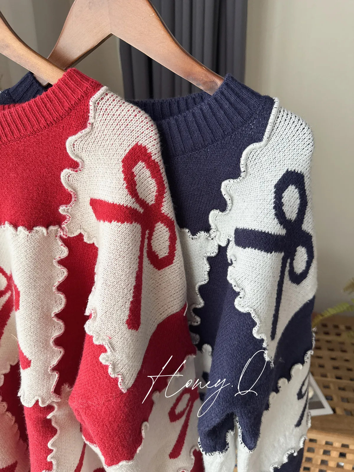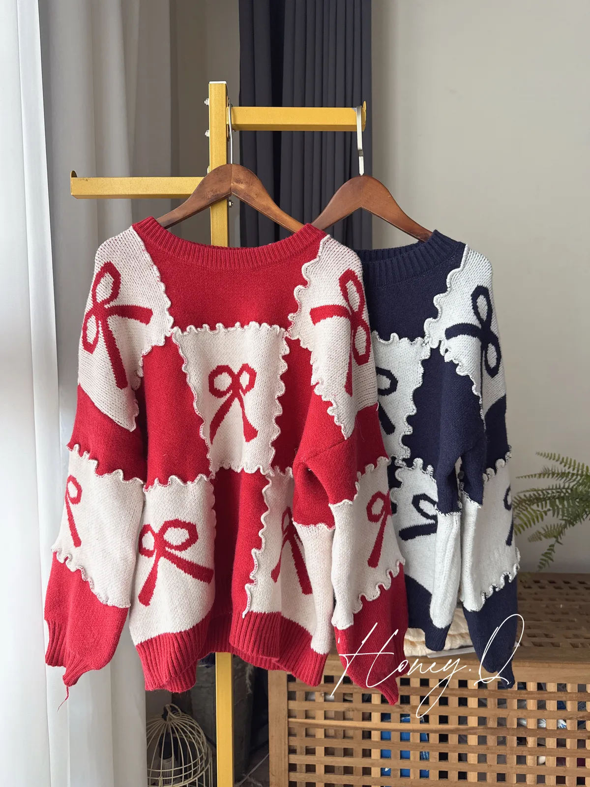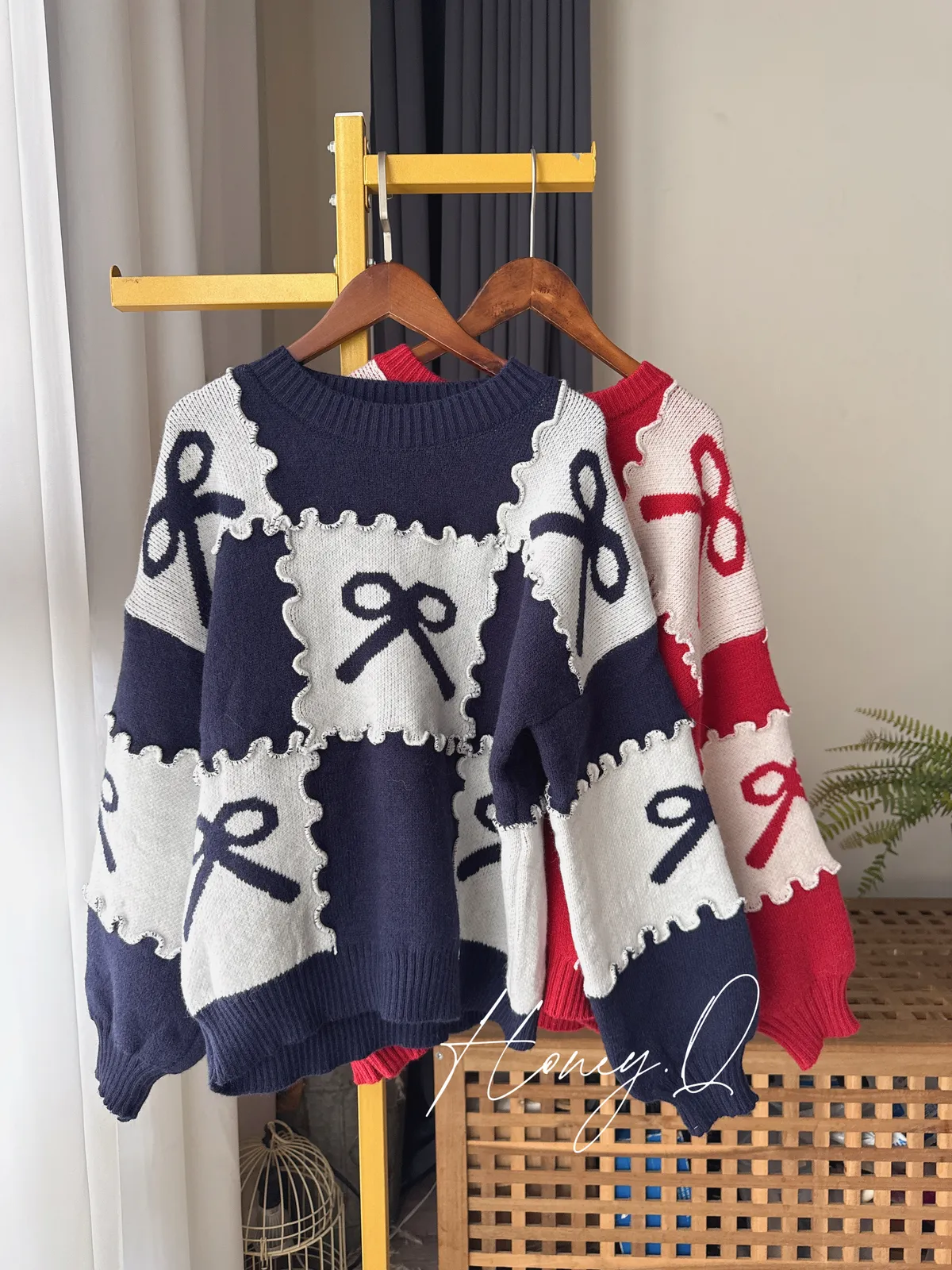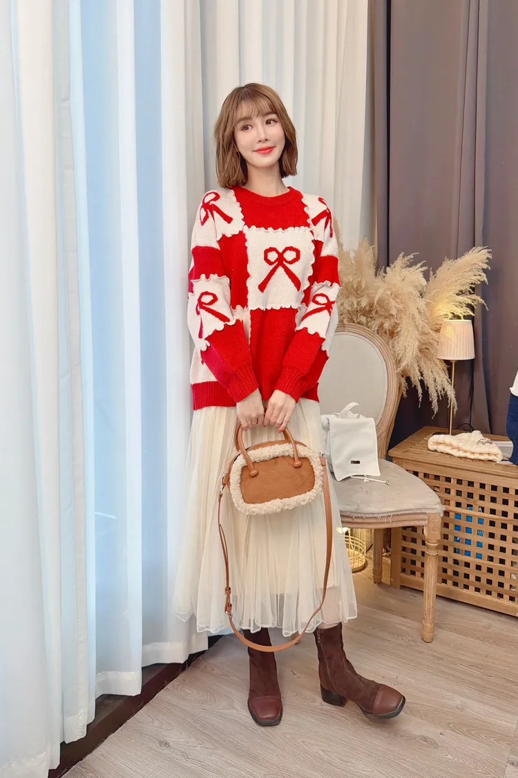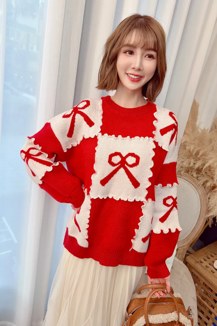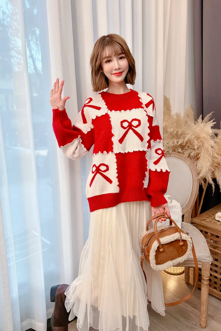 花邊蝴蝶結配色針織上衣/2色