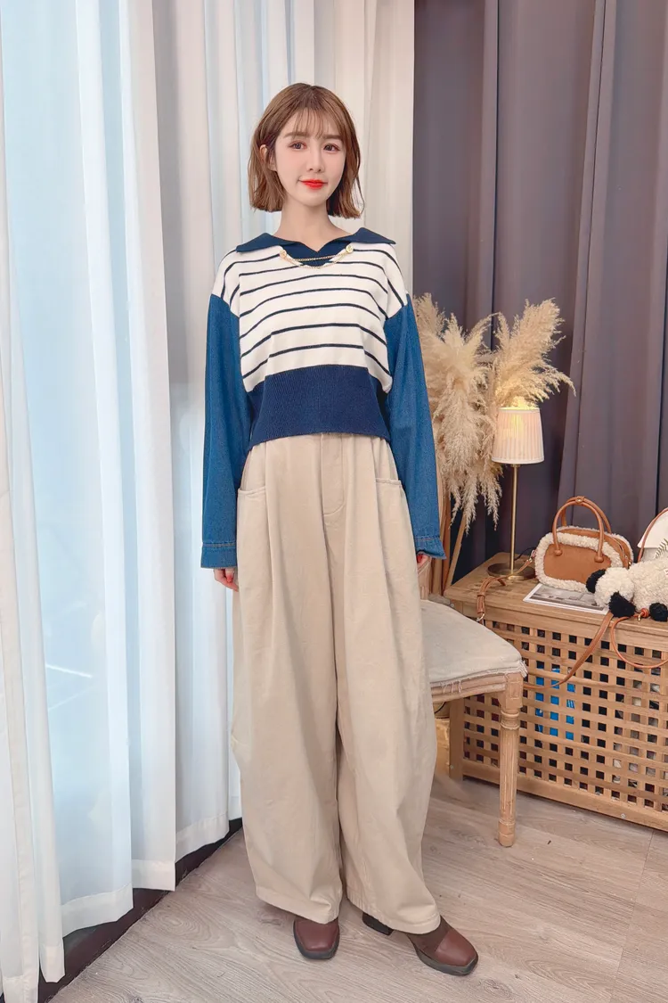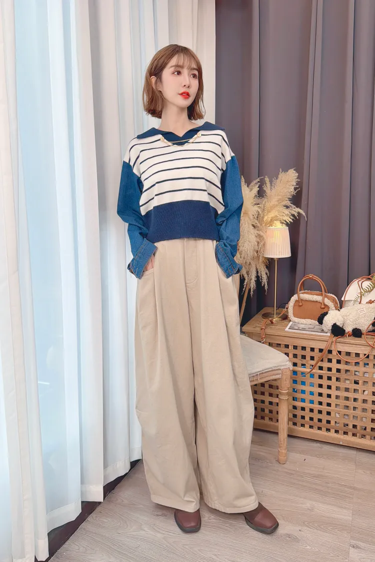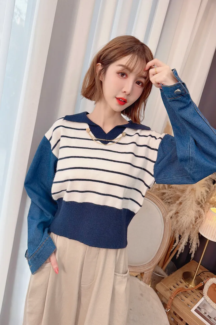 釦環條紋牛仔假兩件上衣/2色