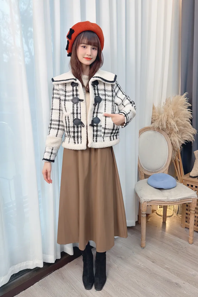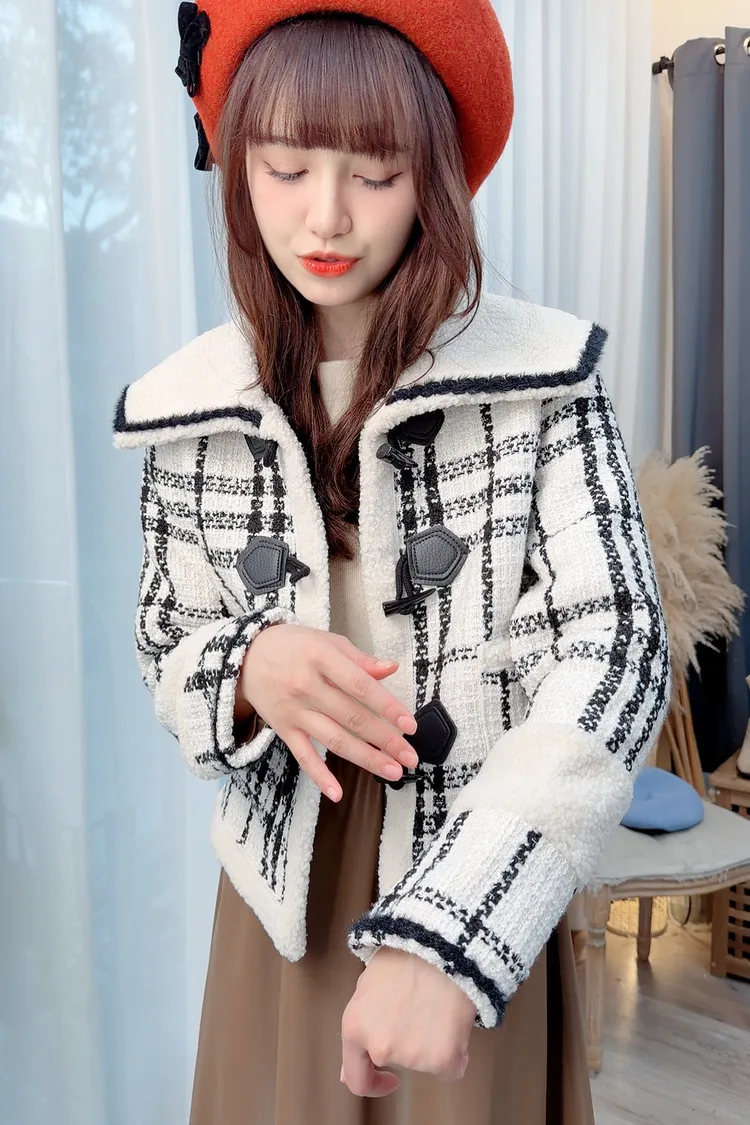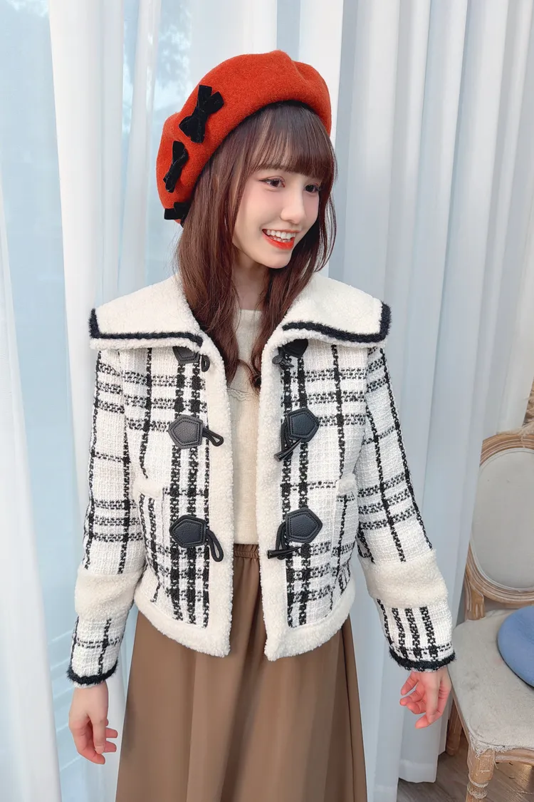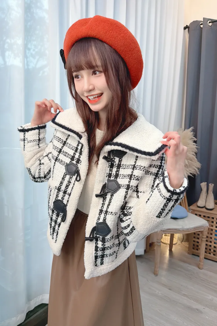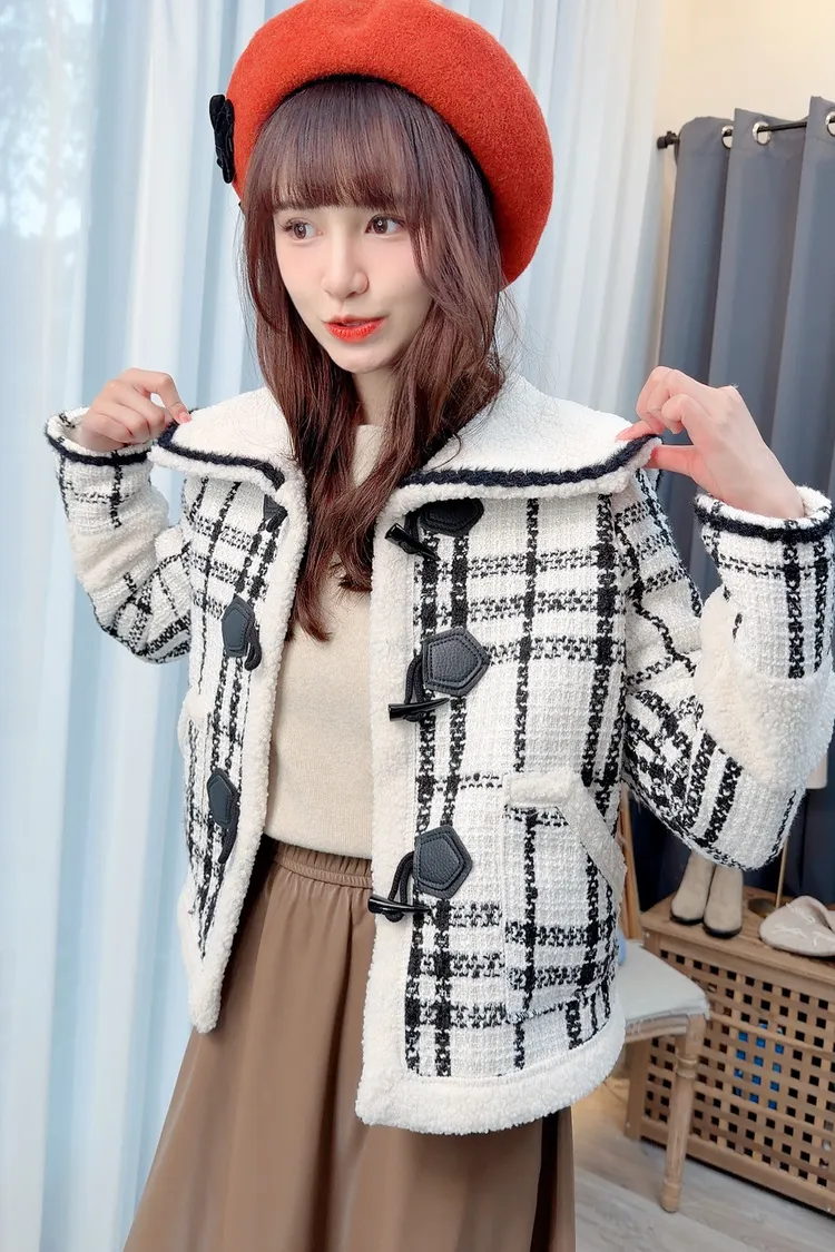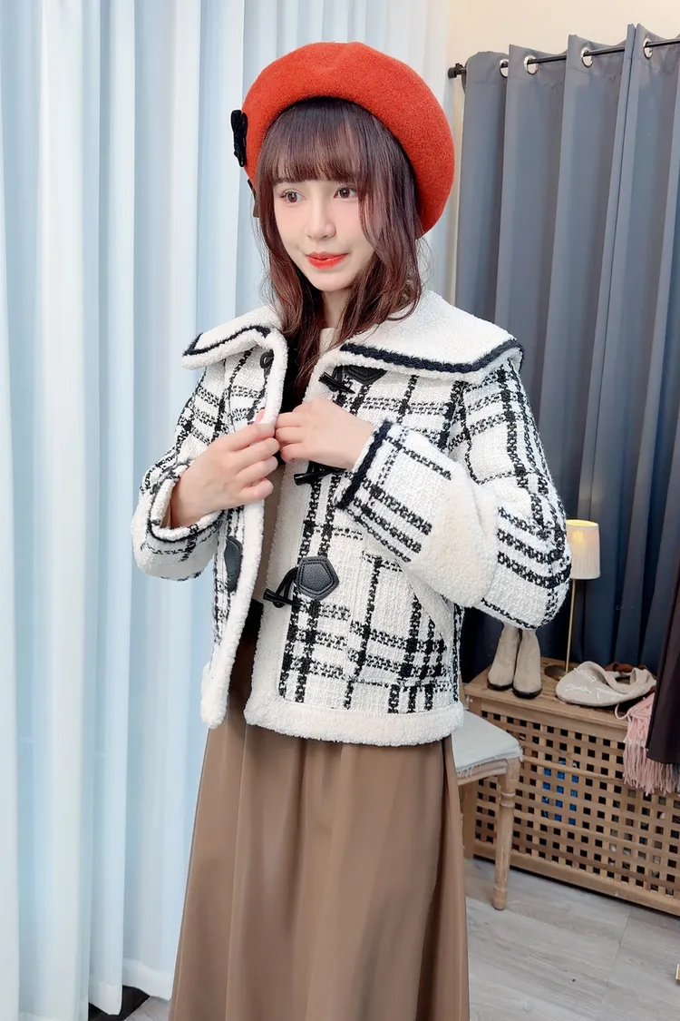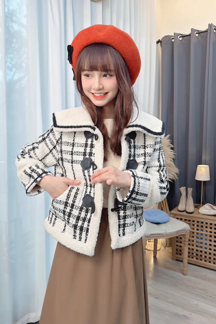 翻領牛角釦格紋外套/1色