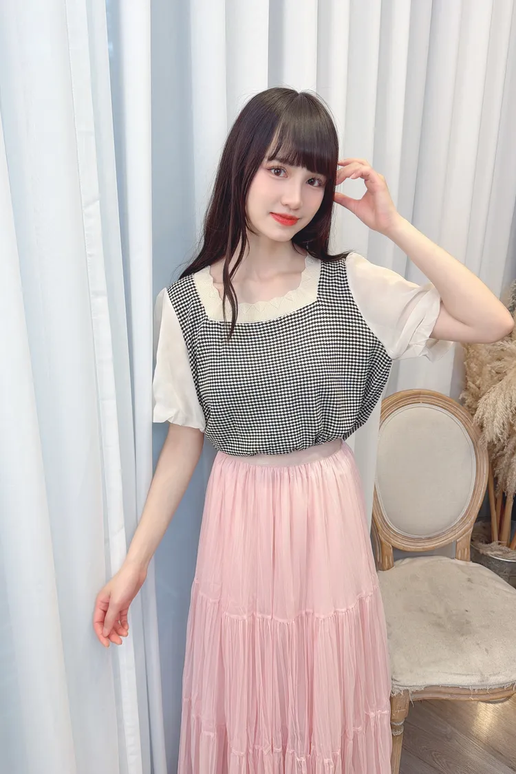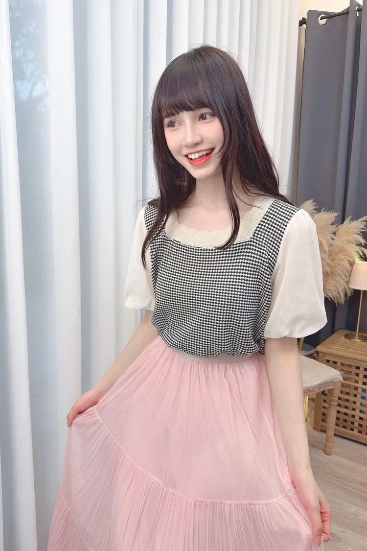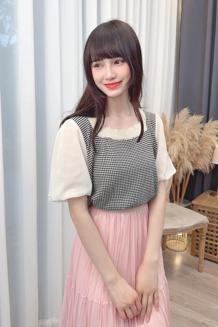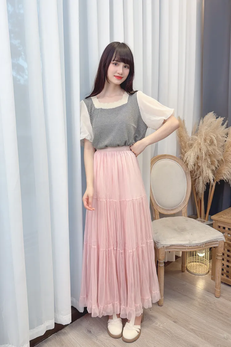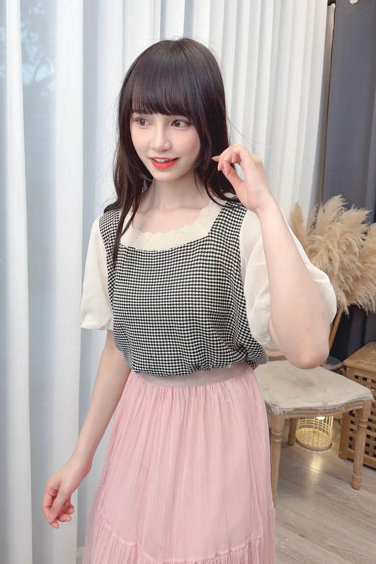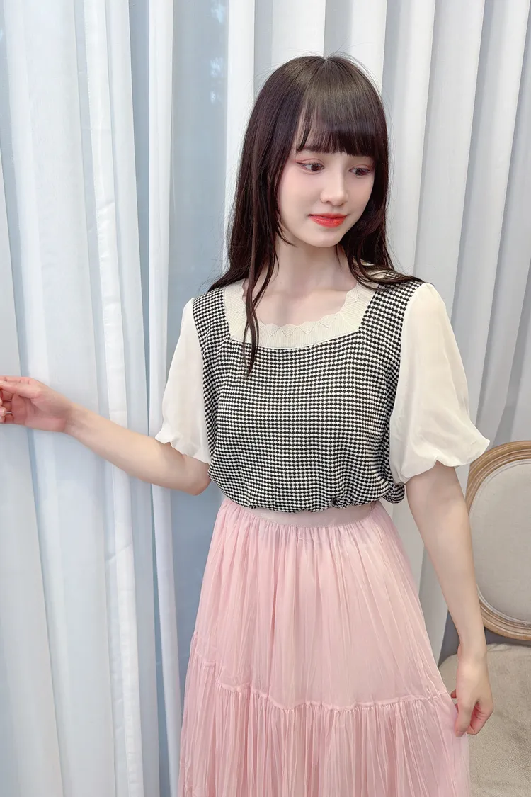 小格紋接雪紡袖上衣/1色