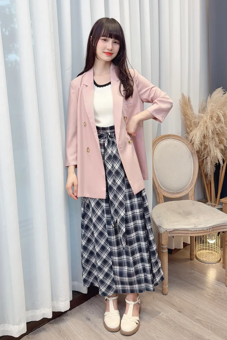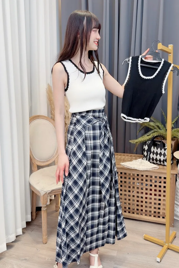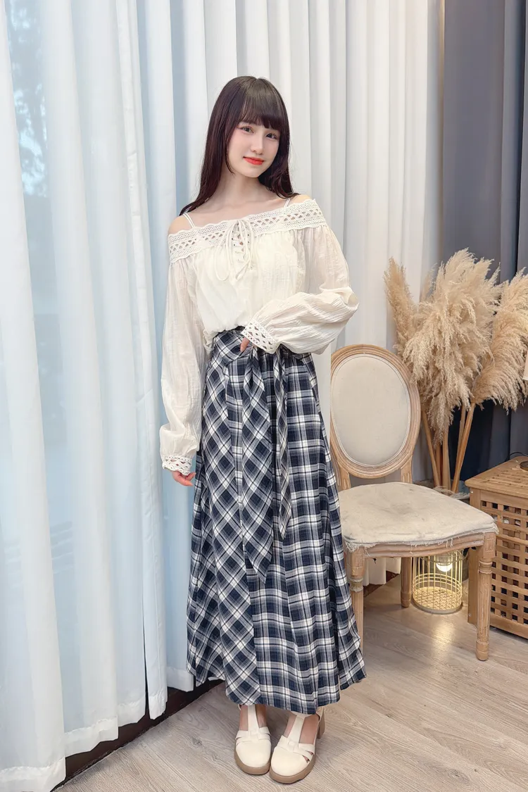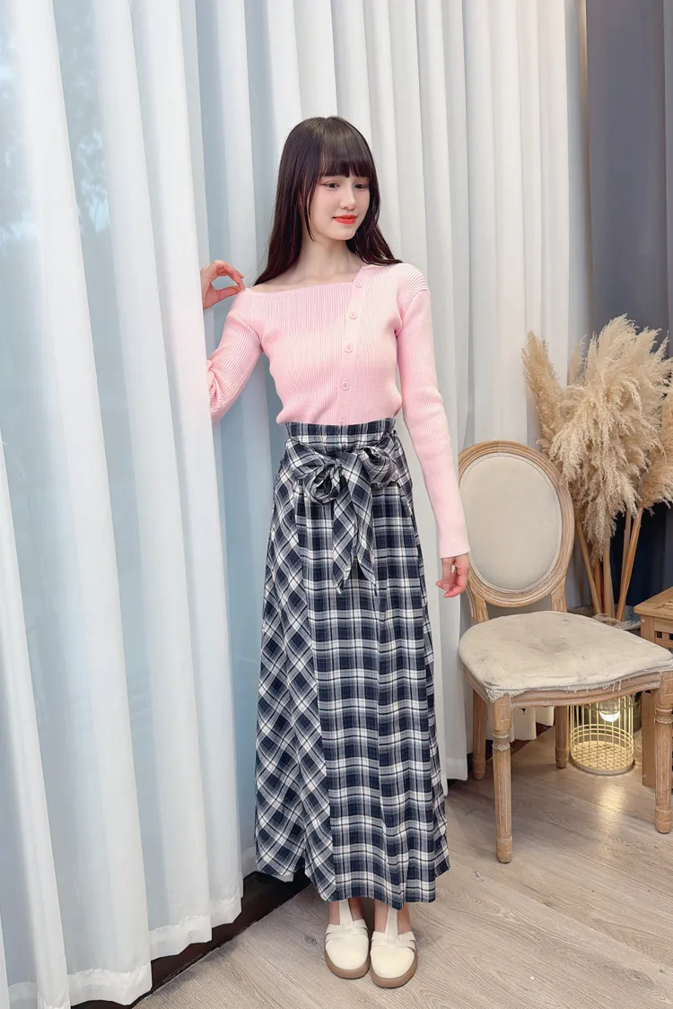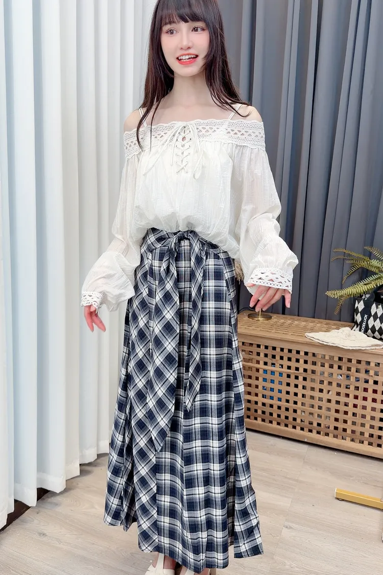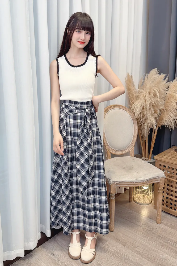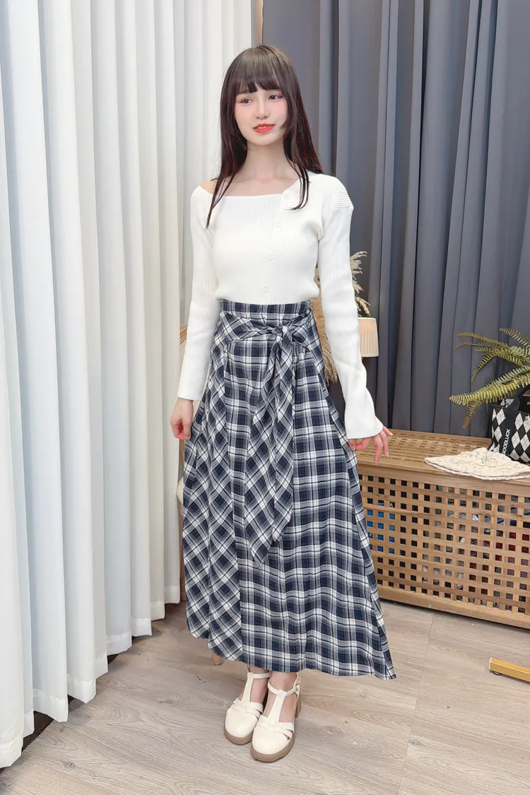 綁帶造型格紋長裙/1色