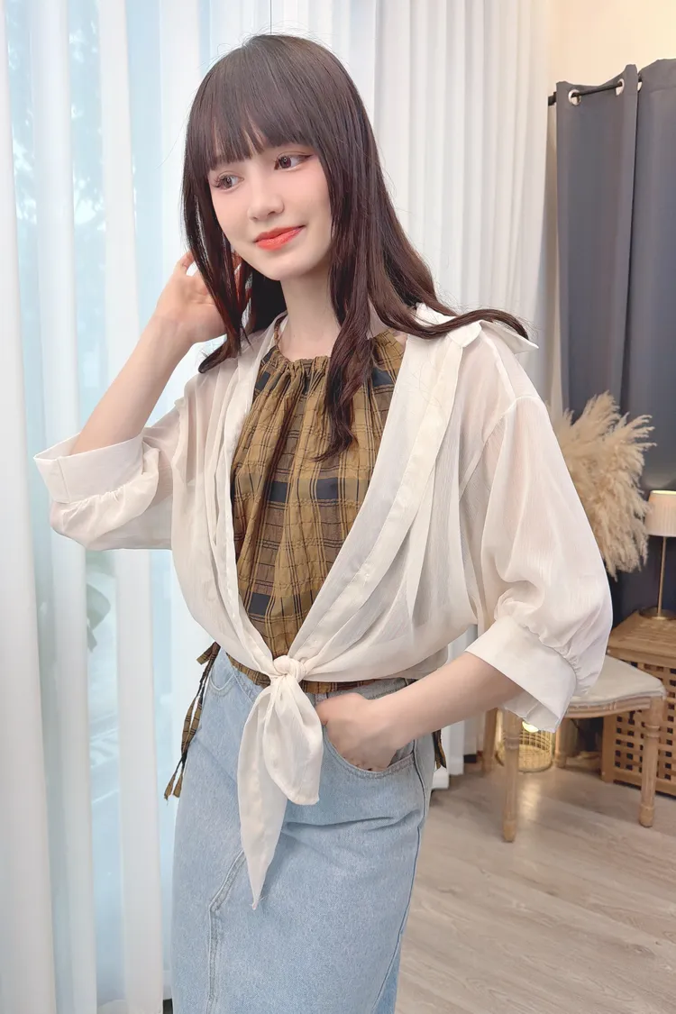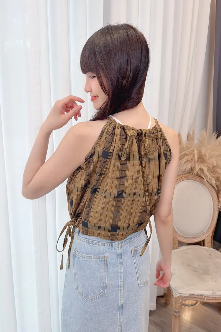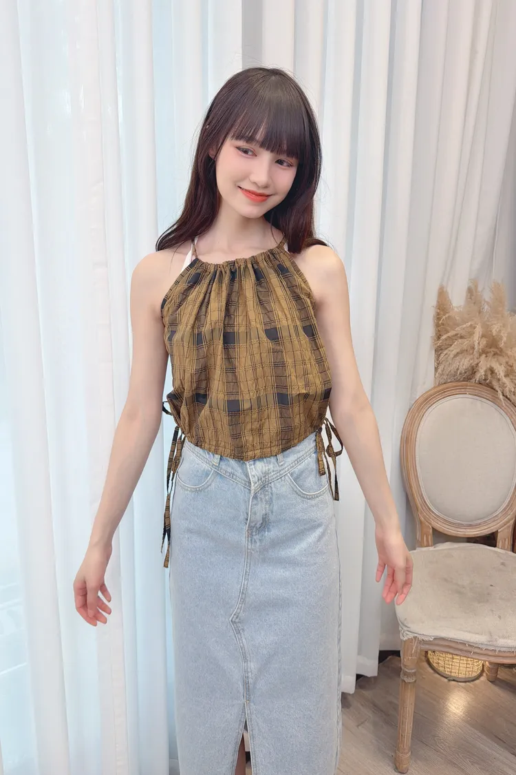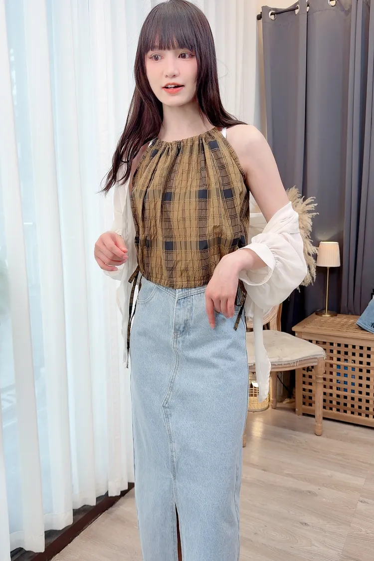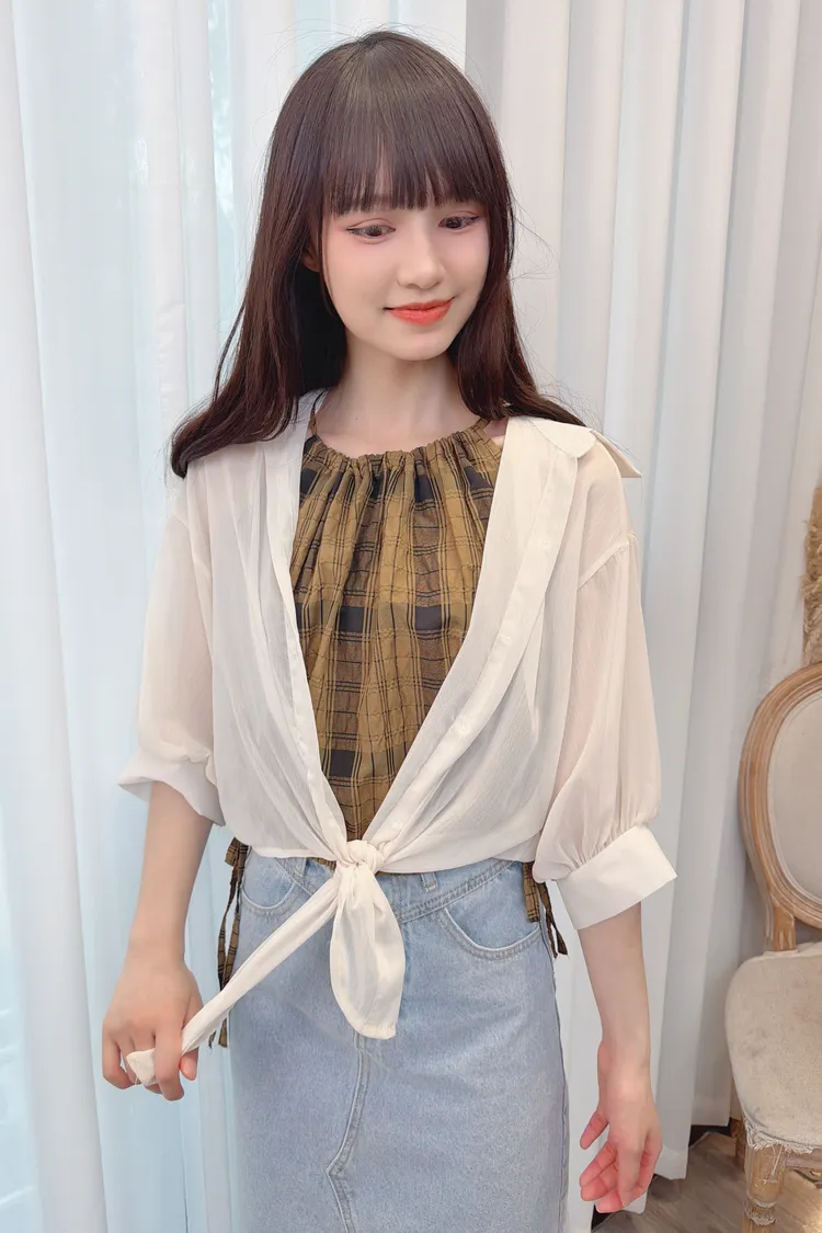 削肩格紋背心加罩衫組/1色
