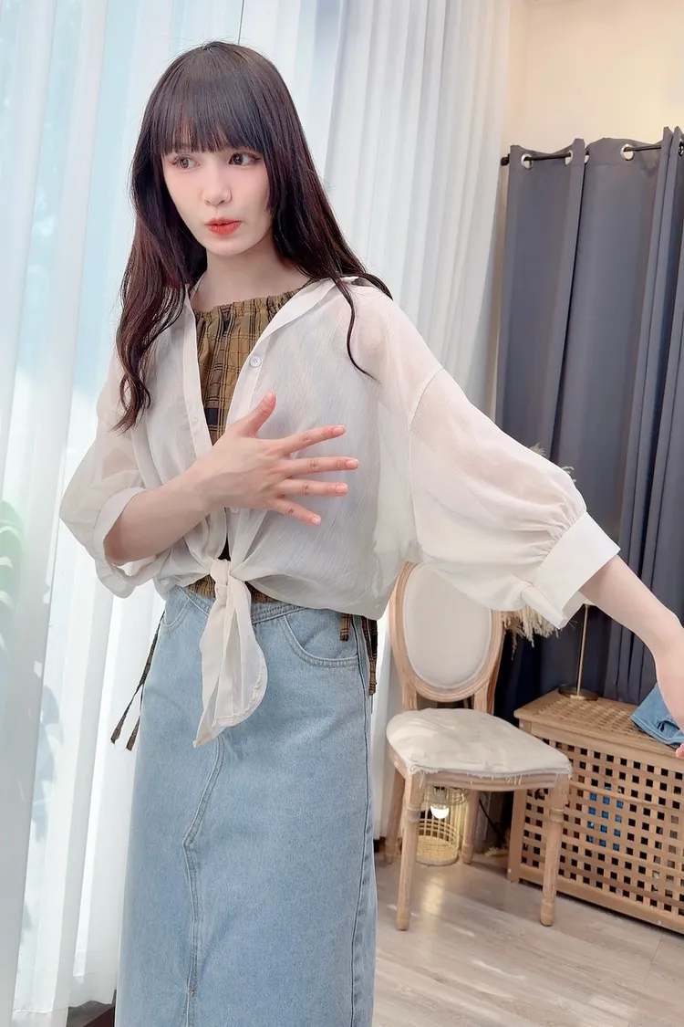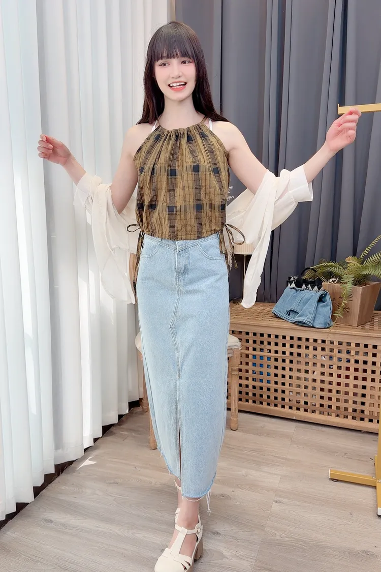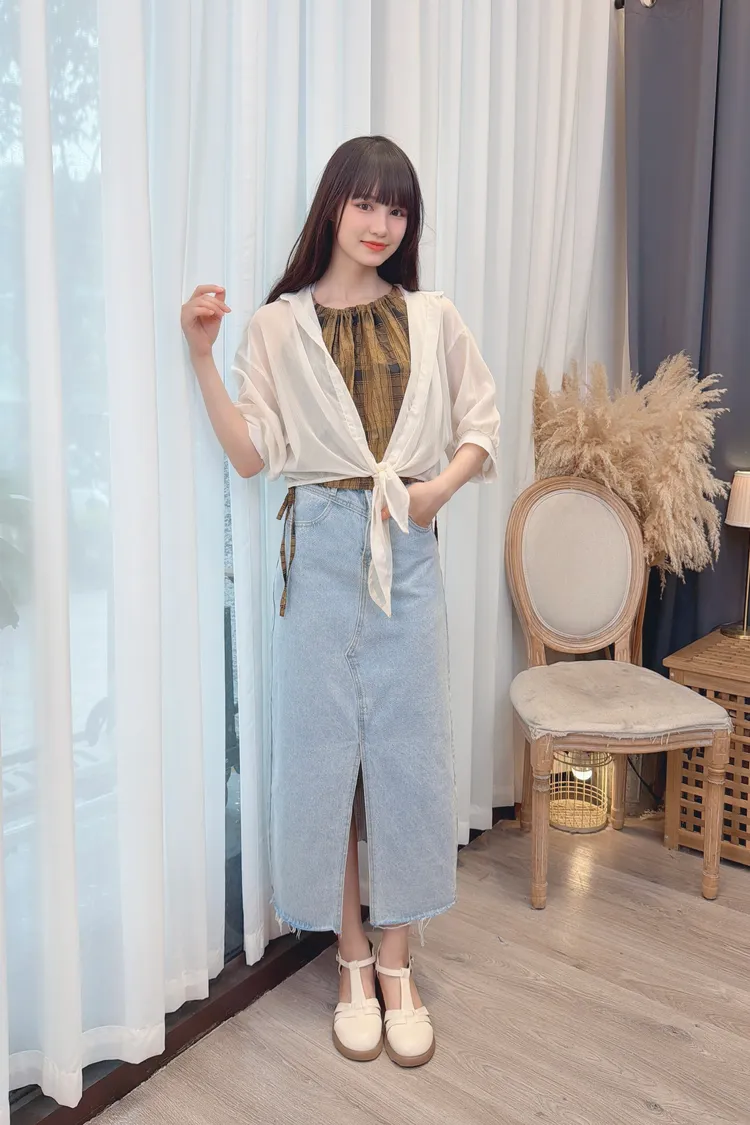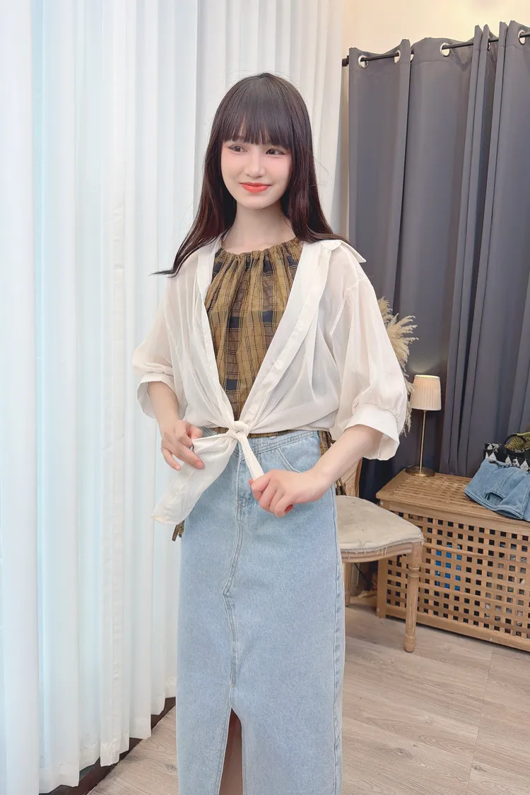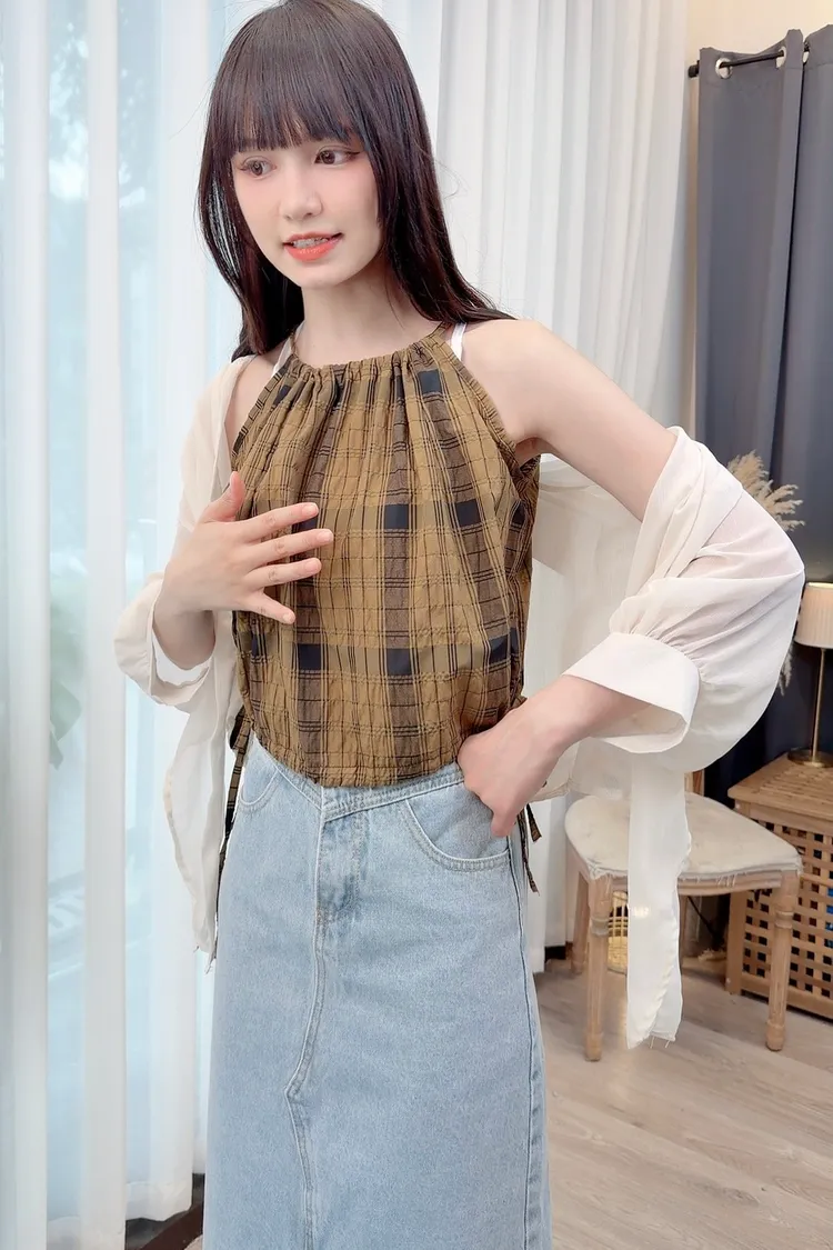 削肩格紋背心加罩衫組/1色