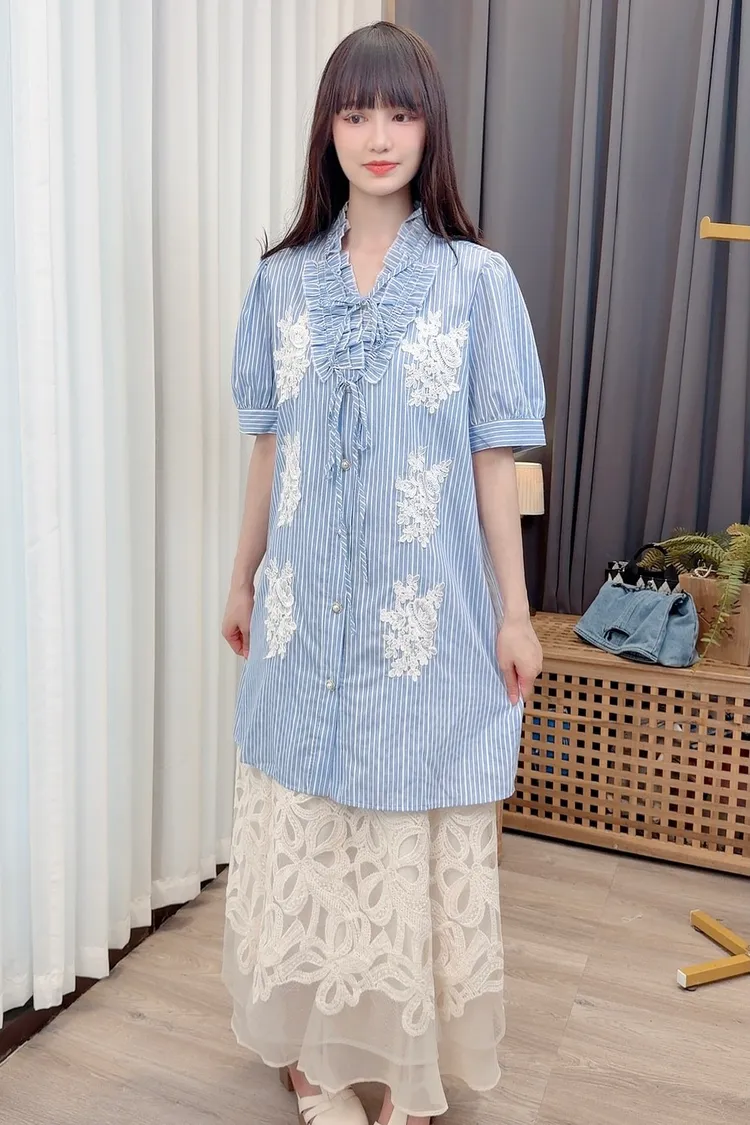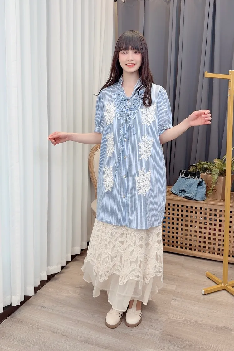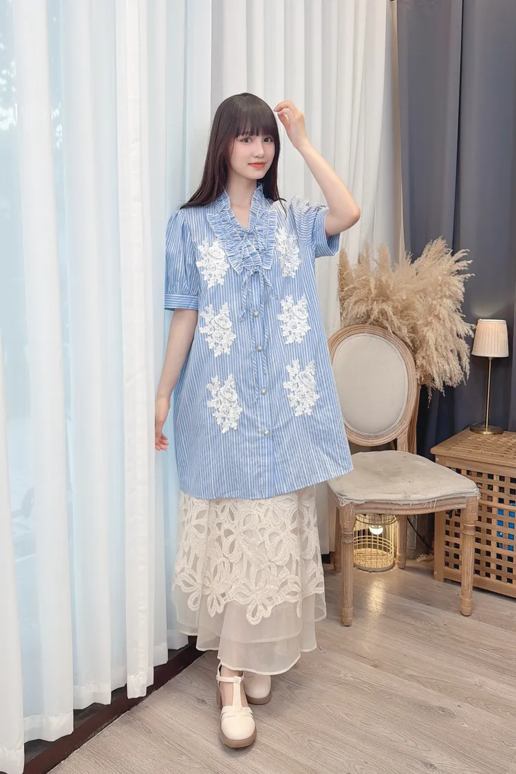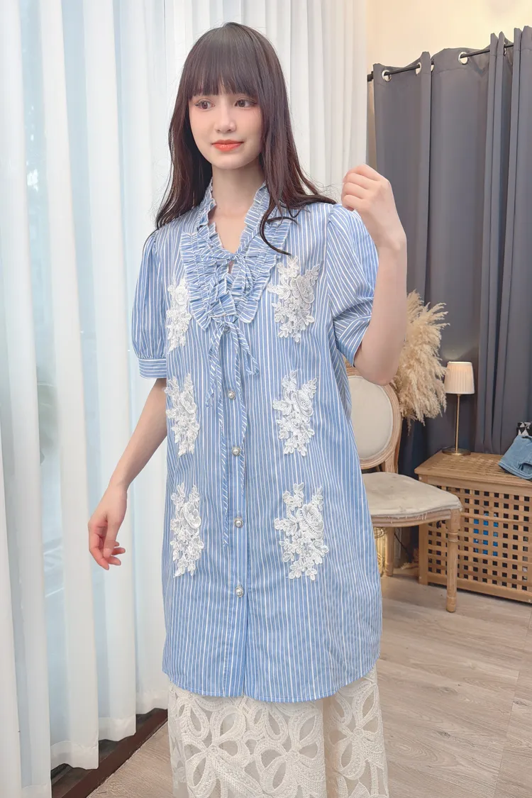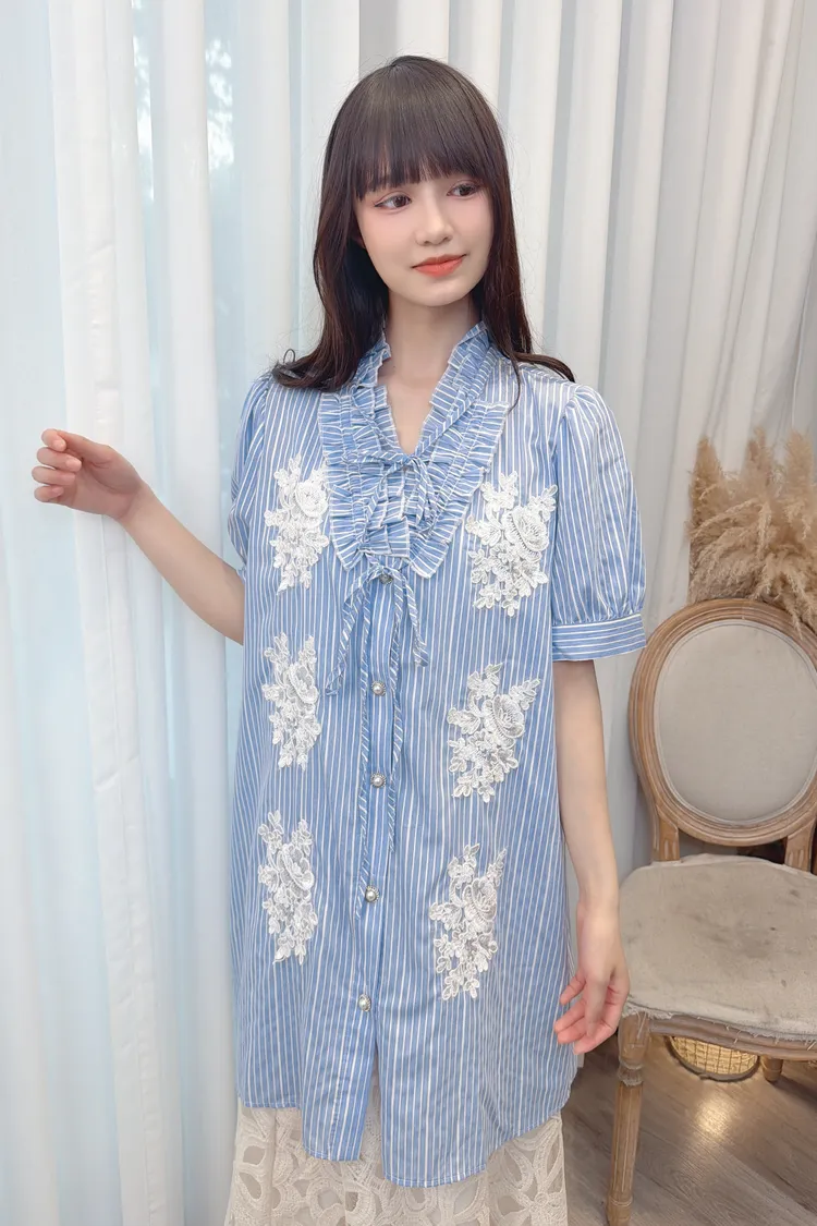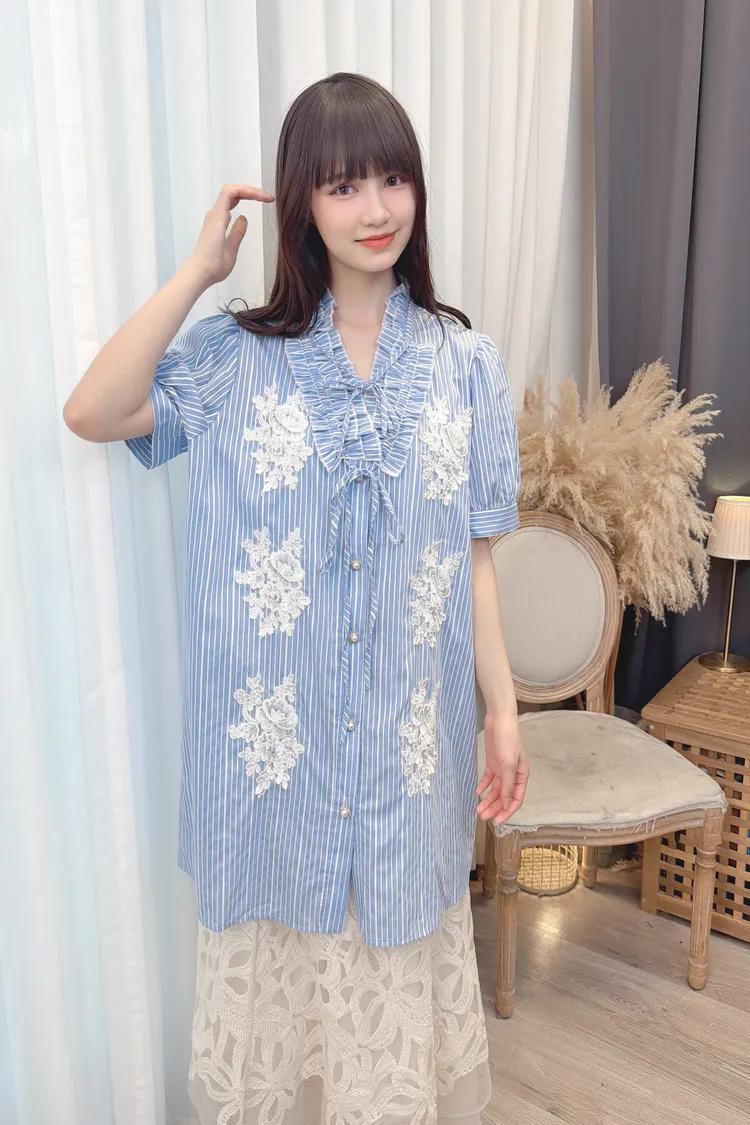 直條蕾絲花長版襯衫洋裝/1色