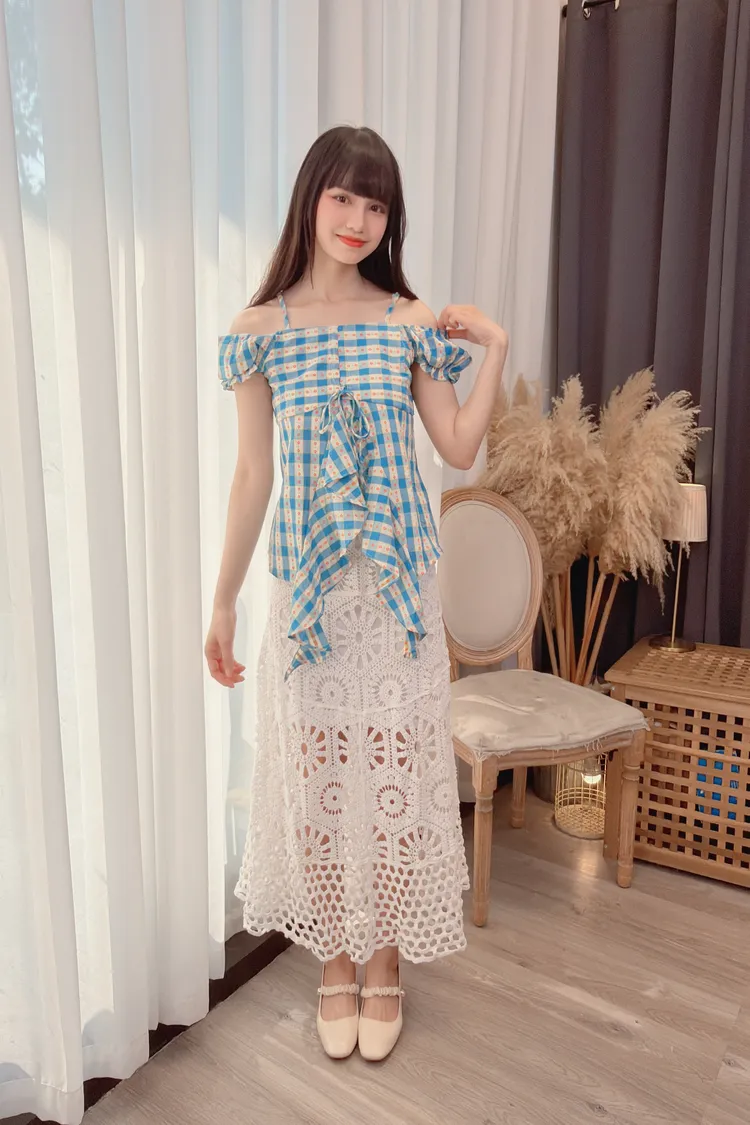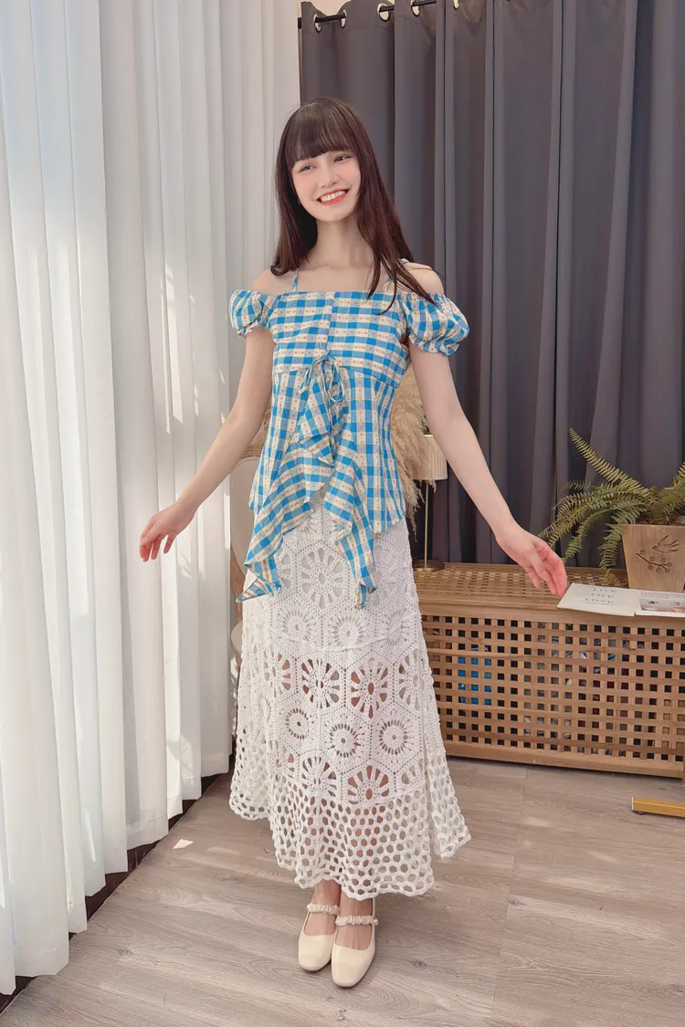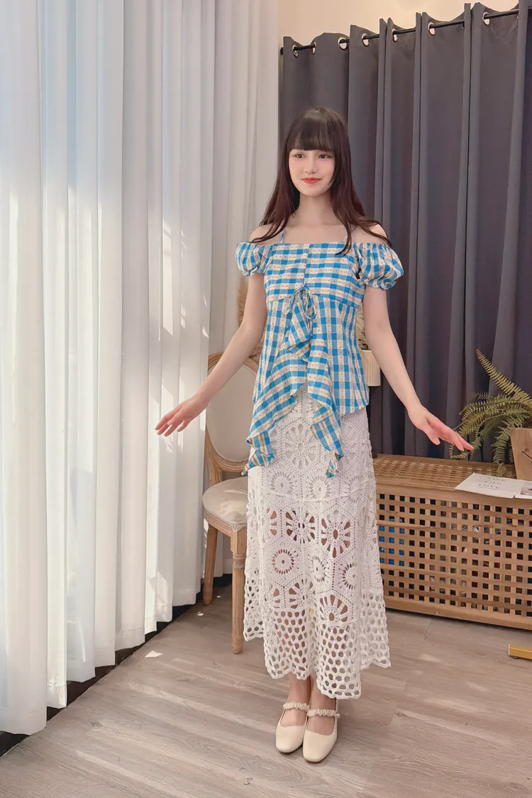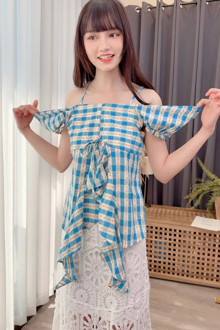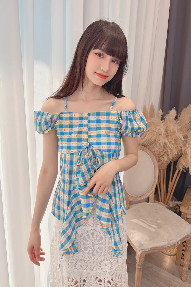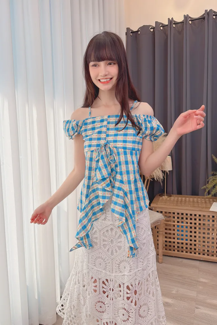 格紋花朵露肩上衣/1色