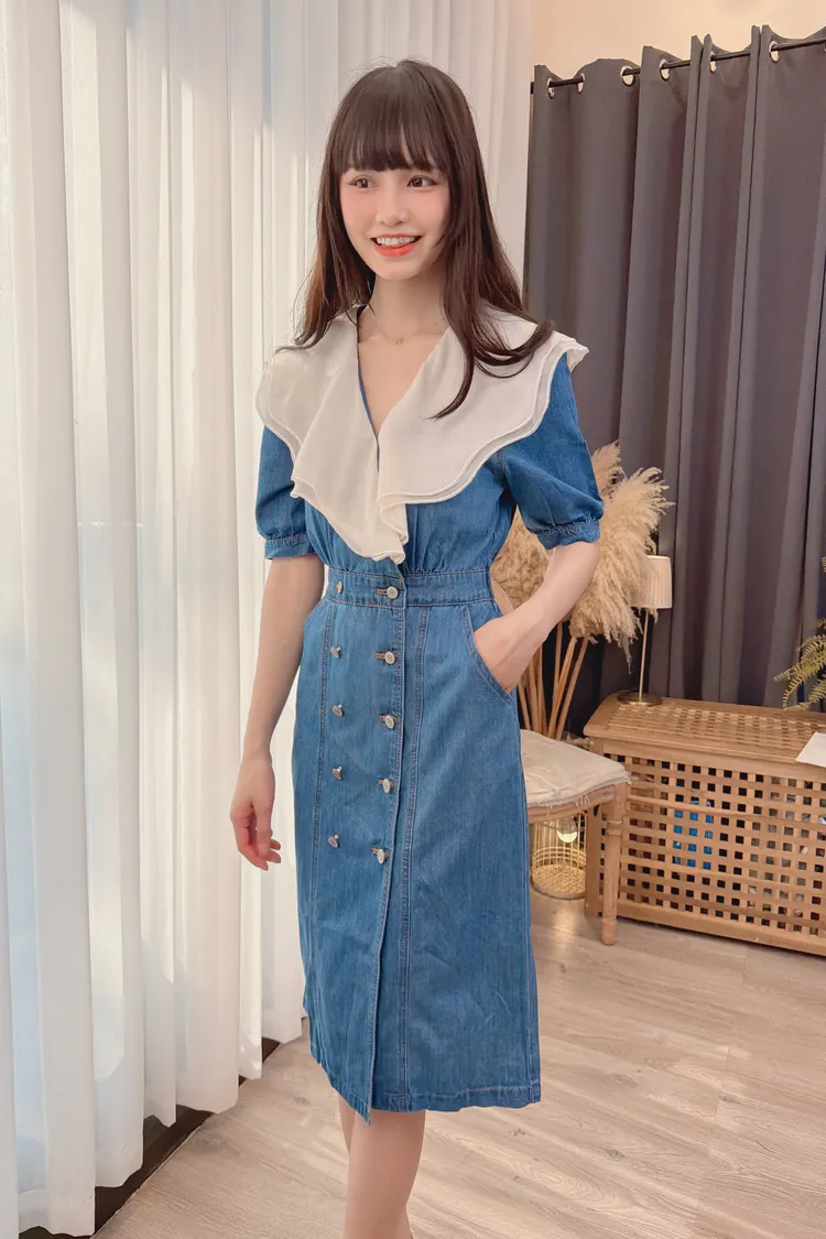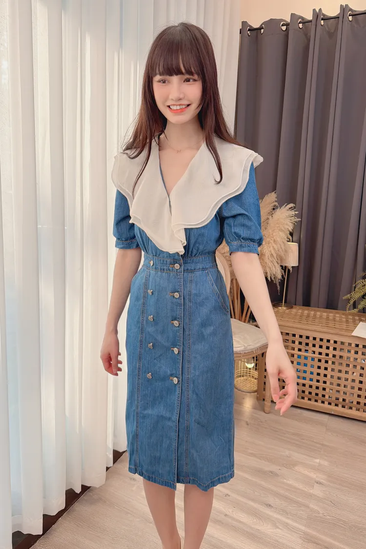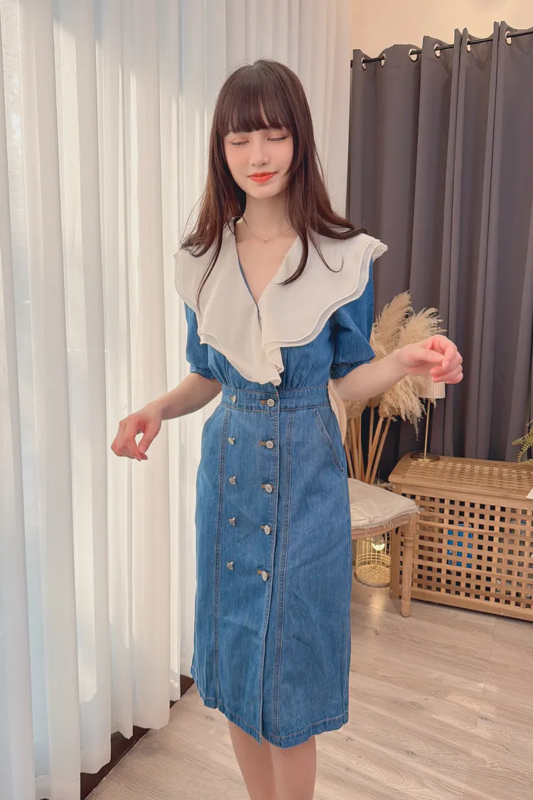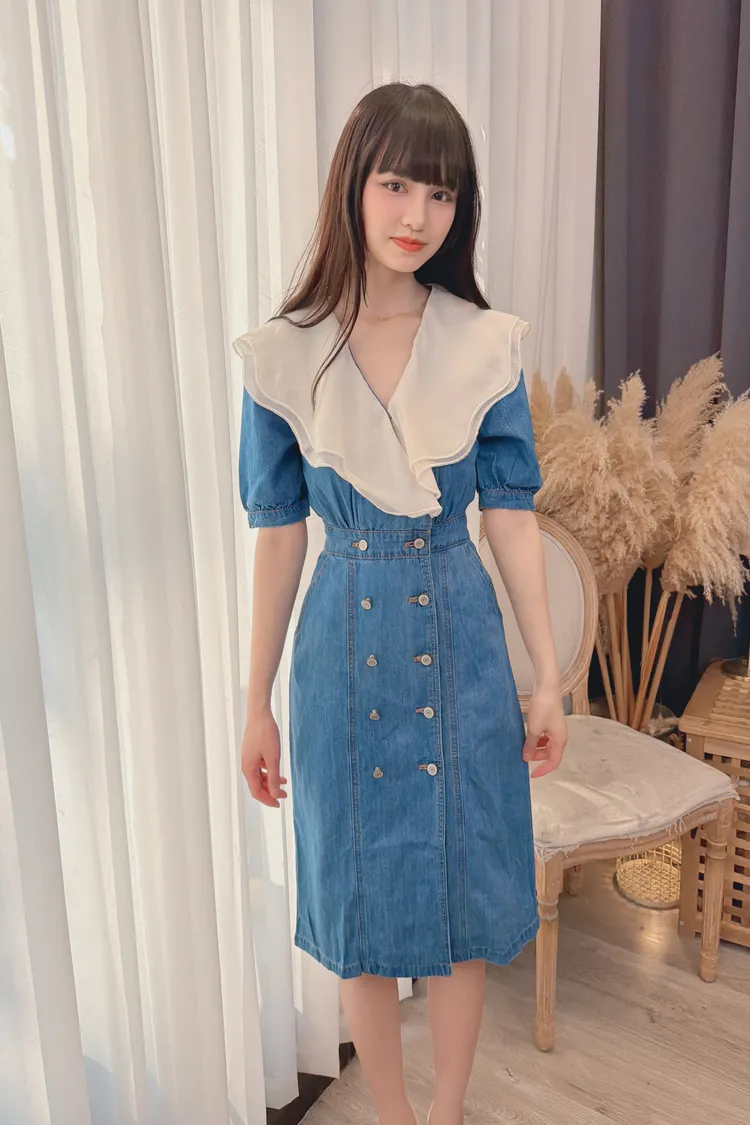 拼接雙層領牛仔洋裝/1色