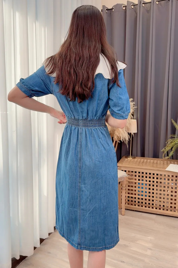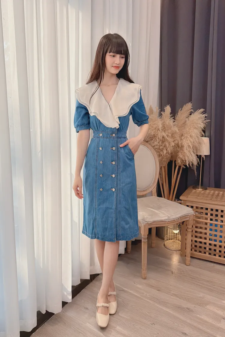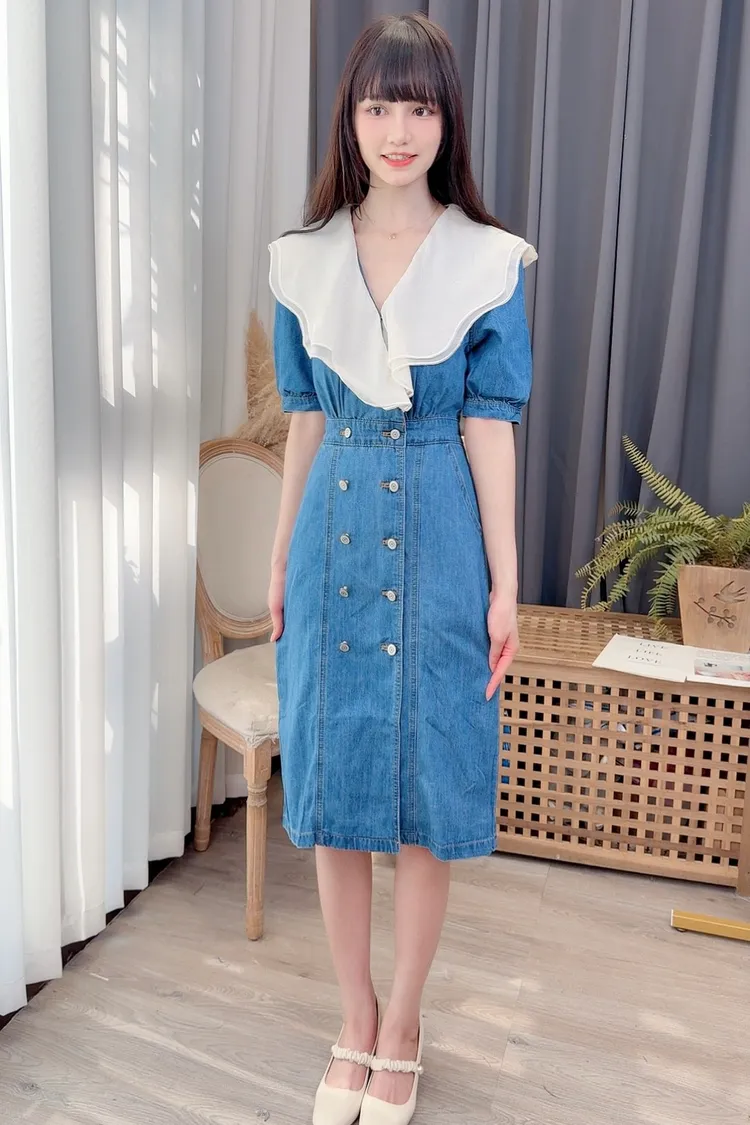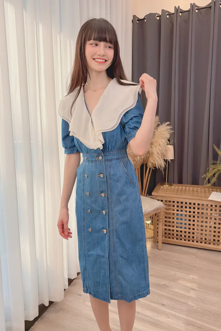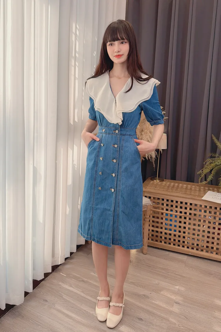 拼接雙層領牛仔洋裝/1色